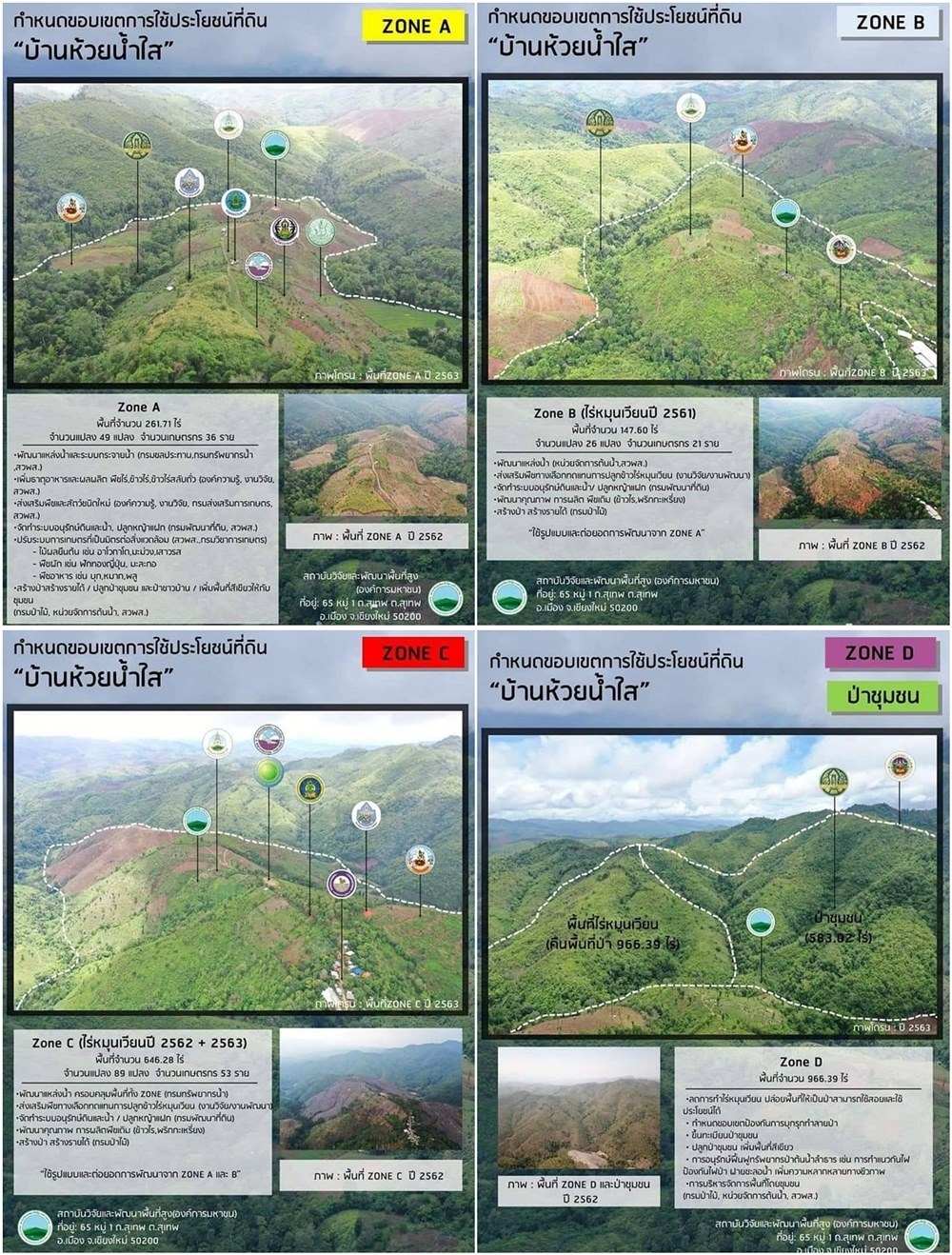 รวมทั้ง บทบาทของแต่ละภาคส่วนที่เข้ามามีส่วนร่วมในการขับเคลื่อนการดำเนินโครงการ ให้ตรงตามบริบทและภูมิสังคมของชุมชน อย่างเป็นระบบครบวงจร สามารถแก้ไขปัญหาของชุมชนได้อย่างถูกต้องและเกิดประสิทธิผลมากที่สุด ประกอบด้วย ด้านเศรษฐกิจ พัฒนาอาชีพเพื่อสร้างรายได้และความมั่นคงด้านอาหาร , ด้านสังคม ส่งเสริมการรวมกลุ่มสร้างความเข้มแข็งของชุมชน , ด้านสิ่งแวดล้อม กำหนดเขตการใช้ที่ดินไม่ให้มีการบุกรุกพื้นที่ป่า อนุรักษ์ฟื้นฟูทรัพยากรธรรมชาติและสิ่งแวดล้อม เช่น ทำฝาย แนวกันไฟป้องกันไฟป่า ปลูกป่าต้นน้ำ และปลูกหญ้าแฝก เป็นต้น , ด้านโครงสร้างพื้นฐาน มีการพัฒนาด้านแหล่งน้ำ ถนนไฟฟ้า และสาธารณูปโภคอื่น ๆ เท่าที่จำเป็นต่อการดำรงชีวิต , การบริหารจัดการและประสานงาน มีหน่วยงานระดับจังหวัดแม่ฮ่องสอน อ.สบเมย องค์การบริหารส่วนตำบลสบเมย สถาบันวิจัยและพัฒนาพื้นที่สูง (องค์การมหาชน) และโครงการพัฒนาพื้นที่สูงแบบโครงการหลวงสบเมย เป็นพี่เลี้ยงหลักทำการประสานงานหน่วยงานสนับสนุน ในการขับเคลื่อนการพัฒนาในพื้นที่ให้บรรลุเป้าหมาย