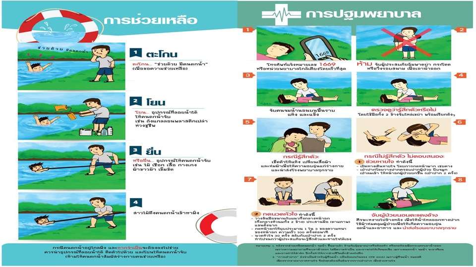 - เมื่อพบผู้บาดเจ็บจากการจมน้ำ ให้เริ่มร้องขอความช่วยเหลือ เช่น จากไลฟ์การ์ดใกล้เคียง หรือจากโทรศัพท์การแพทย์ฉุกเฉิน เบอร์ 1669 และเมื่อสามารถช่วยเหลือผู้บาดเจ็บขึ้นจากน้ำได้แล้ว จึงเริ่มทำการช่วยเหลือต่อ