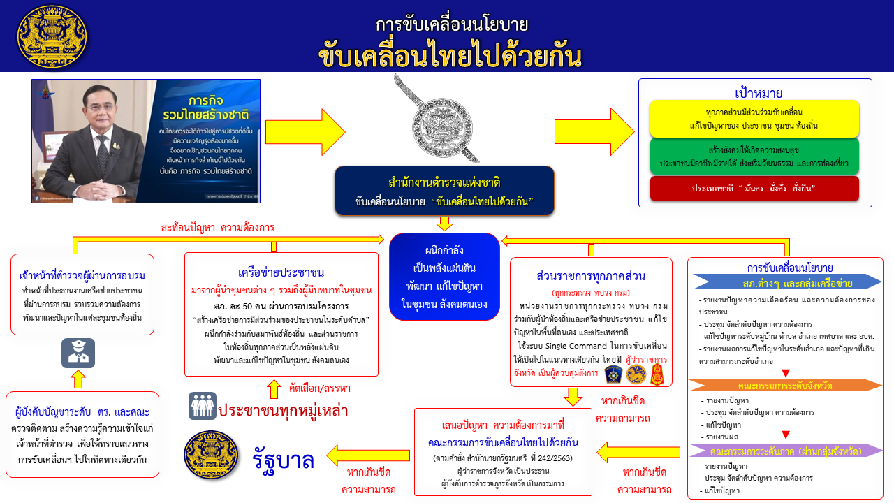 สำนักงานตำรวจแห่งชาติ ภายใต้การนำของ พล.ต.อ.สุวัฒน์ แจ้งยอดสุข ผบ.ตร. และ พล.ต.อ.รอย อิงคไพโรจน์ รอง ผบ.ตร. รับผิดชอบงานป้องกันปราบปรามอาชญากรรม ได้นำนโยบายรัฐบาลมาสู่การปฏิบัติ โดยดำเนินโครงการ “สร้างเครือข่ายการมีส่วนร่วมของประชาชนในการป้องกันอาชญากรรมระดับตำบล เพื่อสนับสนุนการป้องกันอาชญากรรม ของสำนักงานตำรวจแห่งชาติ ตามนโยบายรวมไทยสร้างชาติและขับเคลื่อนไทยไปด้วยกัน (Stronger Together)” โดยมีเป้าหมาย “เพื่อให้ประชาชนมีส่วนร่วม ในการเสนอและแก้ไขปัญหา ชุมชนสังคมมีความสงบเรียบร้อย ประชาชนมีอาชีพ มีรายได้ ส่งเสริมวัฒนธรรมและการท่องเที่ยว เพื่อความผาสุกของประชาชนอย่างยั่งยืน” โดยมอบหมายให้ พล.ต.ท.ประจวบ วงศ์สุข และ พล.ต.ท.ต่อศักดิ์ สุขวิมล ผู้ช่วย ผบ.ตร. ร่วมกันขับเคลื่อนโครงการ