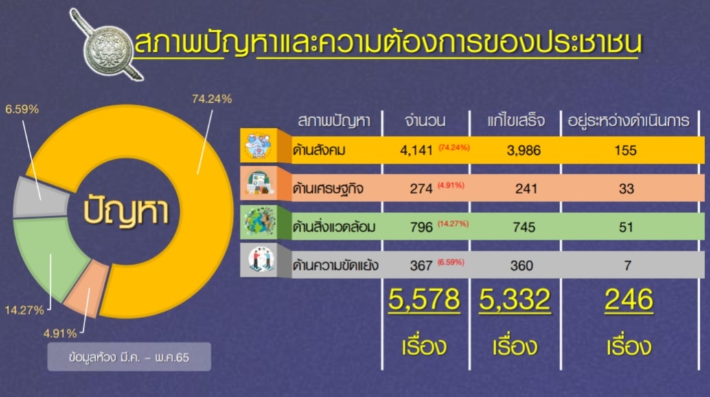 และมีปัญหาที่อยู่ระหว่างหน่วยดำเนินการแก้ไข โดยได้สั่งการเร่งรัดและคาดว่าจะสามารถแก้ไขได้ จำนวน 246 เรื่อง ได้แก่ ปัญหาด้านสังคม 155 เรื่อง ปัญหาด้านสิ่งแวดล้อม 51 เรื่อง ปัญหาด้านเศรษฐกิจ 33 เรื่อง ปัญหาด้านความขัดแย้ง 7 เรื่อง ตามลำดับ