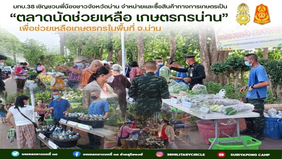 ในการนี้ กองทัพภาคที่ 3 โดย มณฑลทหารบกที่ 38 ได้เข้าให้การช่วยเหลือเกษตรกรที่ได้รับผลกระทบ โดยให้การสนับสนุนเกษตรกรชาวน่าน เปิดพื้นที่หน้าค่ายฯ เป็น “ตลาดนัดช่วยเหลือ เกษตรกรน่าน” และขอเชิญชวนพี่น้องชาวจังหวัดน่าน จำหน่ายและซื้อสินค้าทางการเกษตร รวมทั้งผลผลิตของโครงการทหารพันธุ์ดีน่าน เช่น ผักปลอดภัย ผักพื้นบ้าน หน่อไม้ มะม่วง สับปะรด อะโวคาโด เห็ด ผลิตภัณฑ์จักสานไม้ไผ่ และอื่นๆ อีกมากมาย เพื่อช่วยเหลือเกษตรกรรายย่อยที่ประสบปัญหาในด้านผลผลิตทางการเกษตรล้นตลาด และมีราคาตกต่ำ ในพื้นที่จังหวัดน่าน โดยมีการจำหน่ายสินค้าในวันอังคารของทุกสัปดาห์ ณ บริเวณหน้าค่ายสุริยพงษ์ ตำบลในเวียง อำเภอเมือง จังหวัดน่าน ทำให้กลุ่มเกษตรกรมีความสุข มีรอยยิ้มและมีความซาบซึ้งใจที่ได้รับการช่วยเหลือ ซึ่งเป็นหนึ่งภารกิจในการช่วยเหลือประชาชนตามนโยบายของกองทัพบก ที่ว่า “ทหารเป็นที่พึ่งของประชาชนในทุกโอกาส”