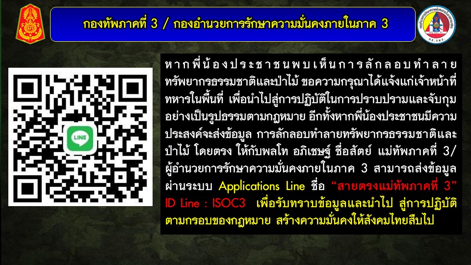 ทั้งนี้ หากพี่น้องประชาชนพบเห็นการลักลอบทำลายทรัพยากรธรรมชาติและป่าไม้ ขอความกรุณาได้แจ้งแก่เจ้าหน้าที่ทหารในพื้นที่ เพื่อนำไปสู่การปฏิบัติในการปราบปรามและจับกุม อย่างเป็นรูปธรรมตามกฎหมาย อีกทั้งหากพี่น้องประชาชนมีความประสงค์จะส่งข้อมูล การลักลอบทำลายทรัพยากรธรรมชาติและป่าไม้ โดยตรง ให้กับ พลโท อภิเชษฐ์ ซื่อสัตย์ แม่ทัพภาคที่ 3/ผู้อำนวยการรักษาความมั่นคงภายในภาค 3 สามารถส่งข้อมูลผ่านระบบ Application Line ชื่อ “สายตรงแม่ทัพภาคที่ 3” ID Line : ISOC3 เพื่อรับทราบข้อมูลและนำไปสู่การปฏิบัติตามกรอบของกฎหมาย สร้างความมั่นคงให้สังคมไทยสืบไป