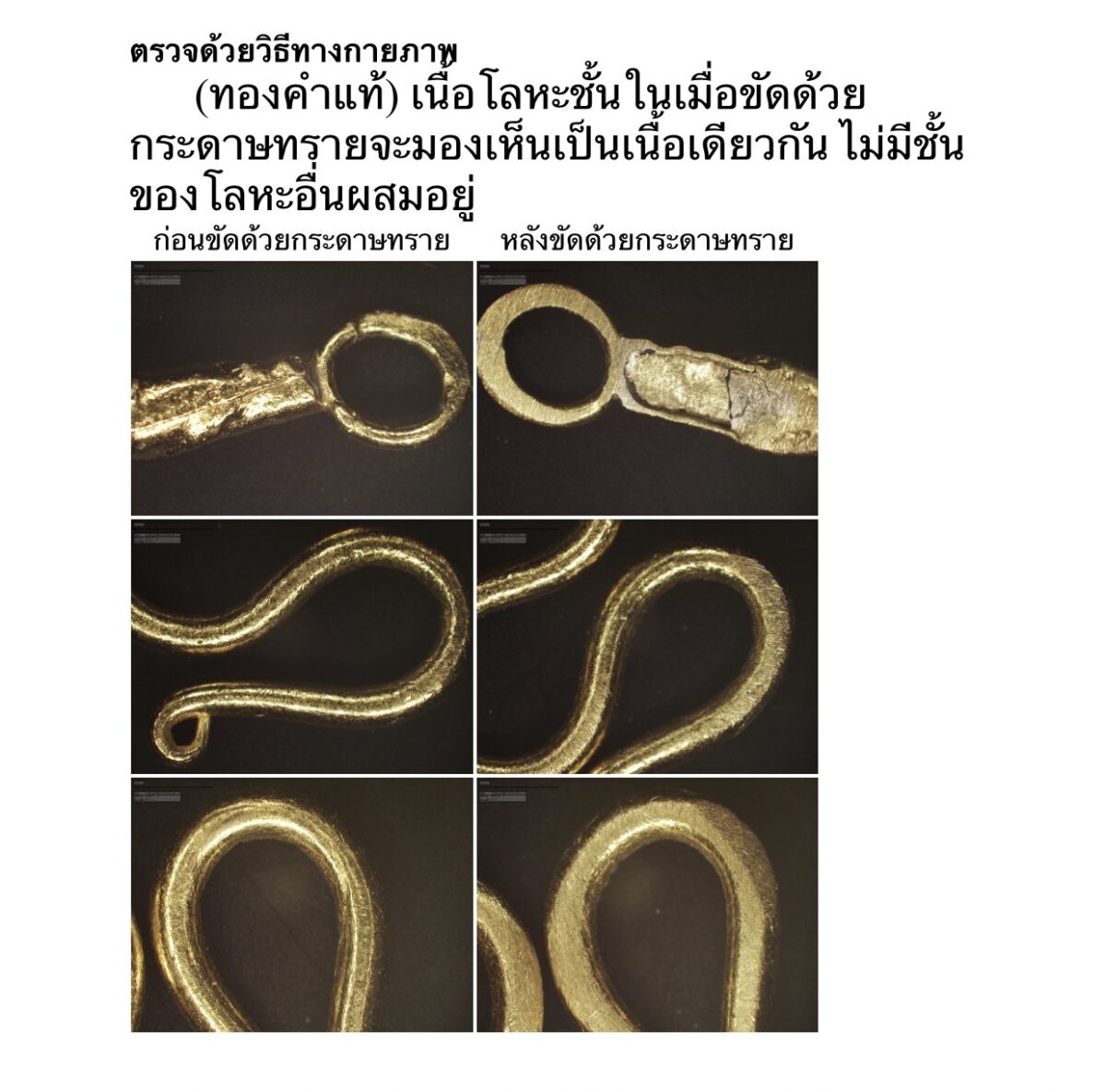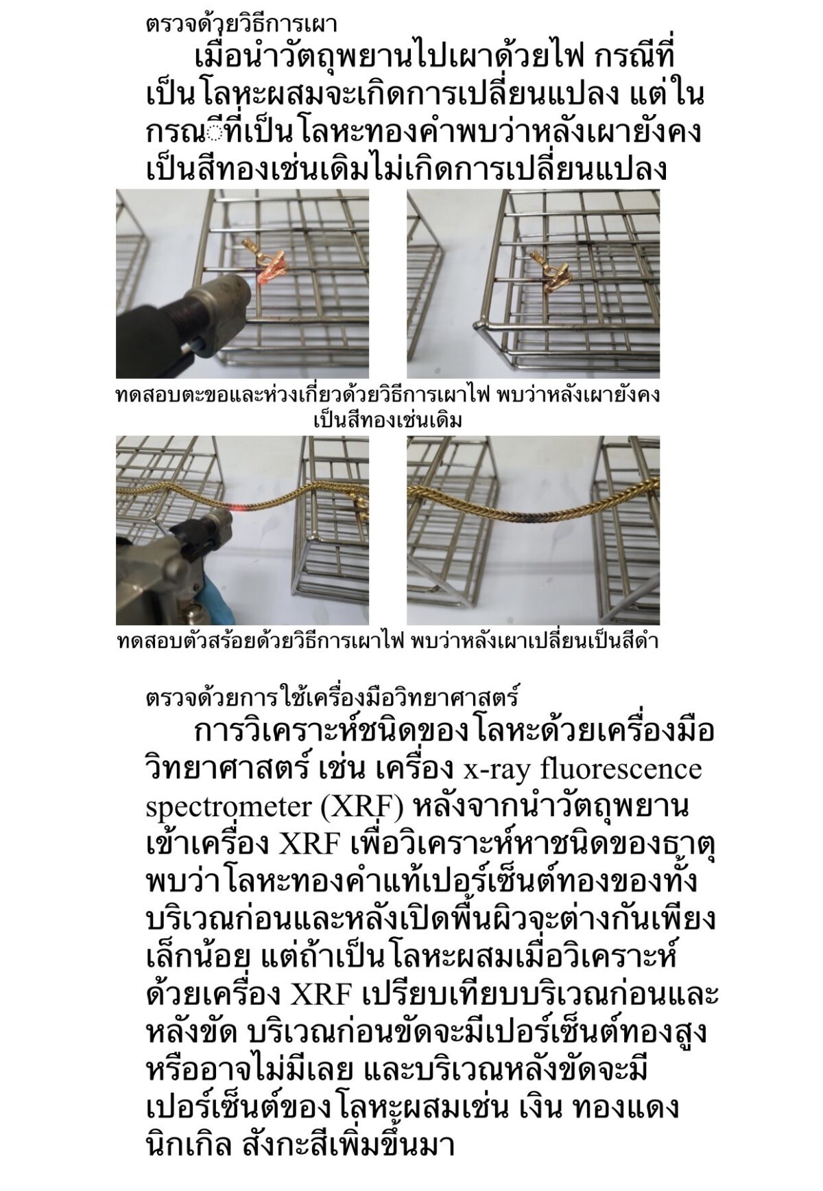 หากนำไปทดสอบด้วยการเผาไฟทองคำแท้ จะไม่เกิดการเปลี่ยนแปลง ซึ่งจะแตกต่างจากโลหะผสม ที่เมื่อนำไปเผาไฟจะเกิดการเปลี่ยนแปลงทันที หากนำวัตถุพยานมาวิเคราะห์หาชนิดของธาตุโดยใช้เครื่องมือวิทยาศาสตร์ เช่น เครื่อง x-ray fluorescence spectrometer (XRF) หลังจากนำวัตถุพยานเข้าเครื่อง XRF เพื่อวิเคราะห์หาชนิดของธาตุ พบว่าโลหะทองคำแท้เปอร์เซ็นต์ทองของทั้งบริเวณก่อนและหลังเปิดพื้นผิวจะต่างกันเพียงเล็กน้อยเท่านั้น