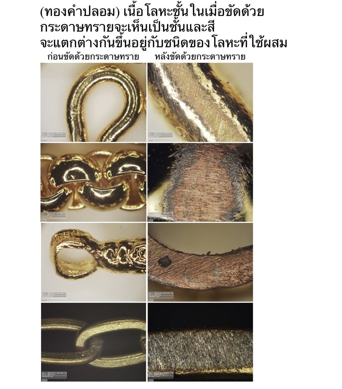 กรณีที่วัตถุพยานเป็นโลหะทองคำ เมื่อนำไปวิเคราะห์ด้วยวิธีทางกายภาพ โดยการเปิดพื้นผิวด้วยกระดาษทราย เนื้อโลหะชั้นในจะมองเห็นเป็นเนื้อเดียวกัน เมื่อนำไปทดสอบทางเคมีด้วยกรด เช่น กรดไนตริก รวมถึงการทำปฏิกิริยาทางเคมี เพื่อให้ทราบเป็นโลหะชนิดใด