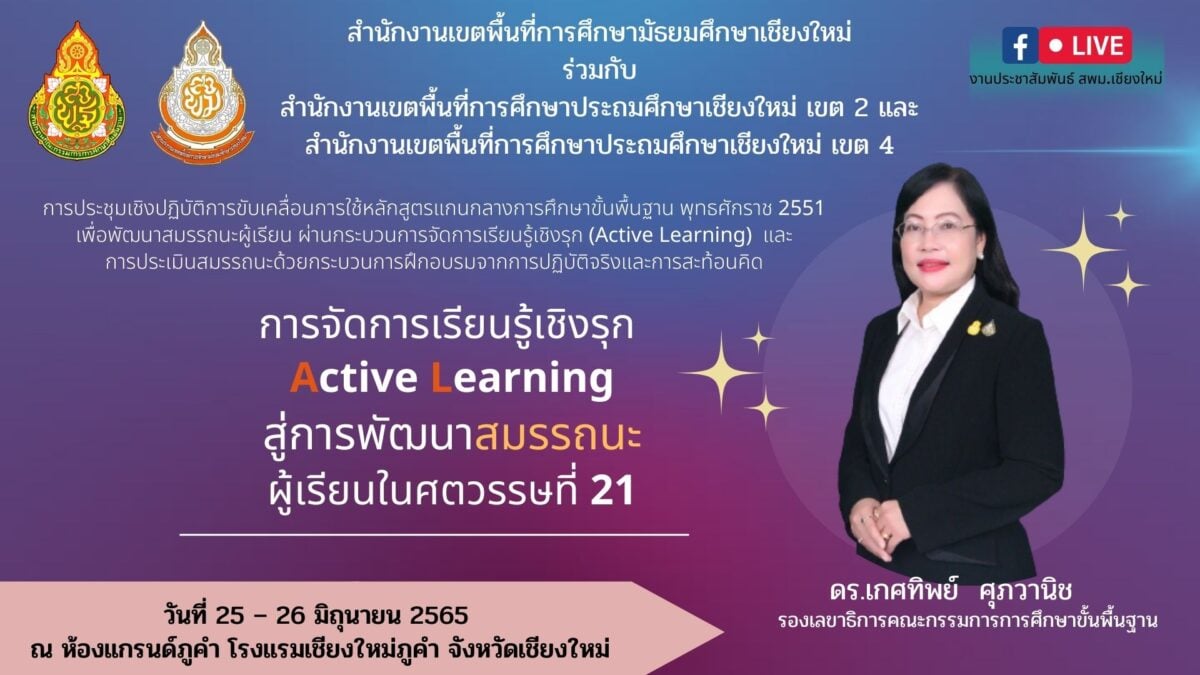 ขอเชิญชวนบุคลการทางการศึกษาที่สนใจ เข้าร่วมการประชุมเชิงปฏิบัติการการขับเคลื่อนการใช้หลักสูตรแกนกลางการศึกษาขั้นพื้นฐาน พุทธศักราช 2551 เพื่อพัฒนาสมรรถนะผู้เรียน ผ่านกระบวนการจัดการเรียนรู้เชิงรุก (Active Learning) และการประเมินผลสมรรถนะด้วยกระบวนการฝึกอบรมจากการปฏิบัติจริง และสะท้อนคิด ในวันที่ 25-26 มิถุนายน 2565
