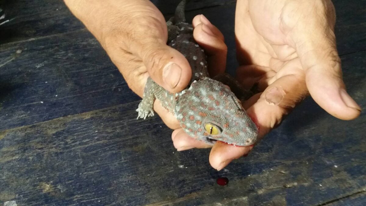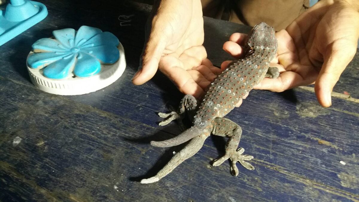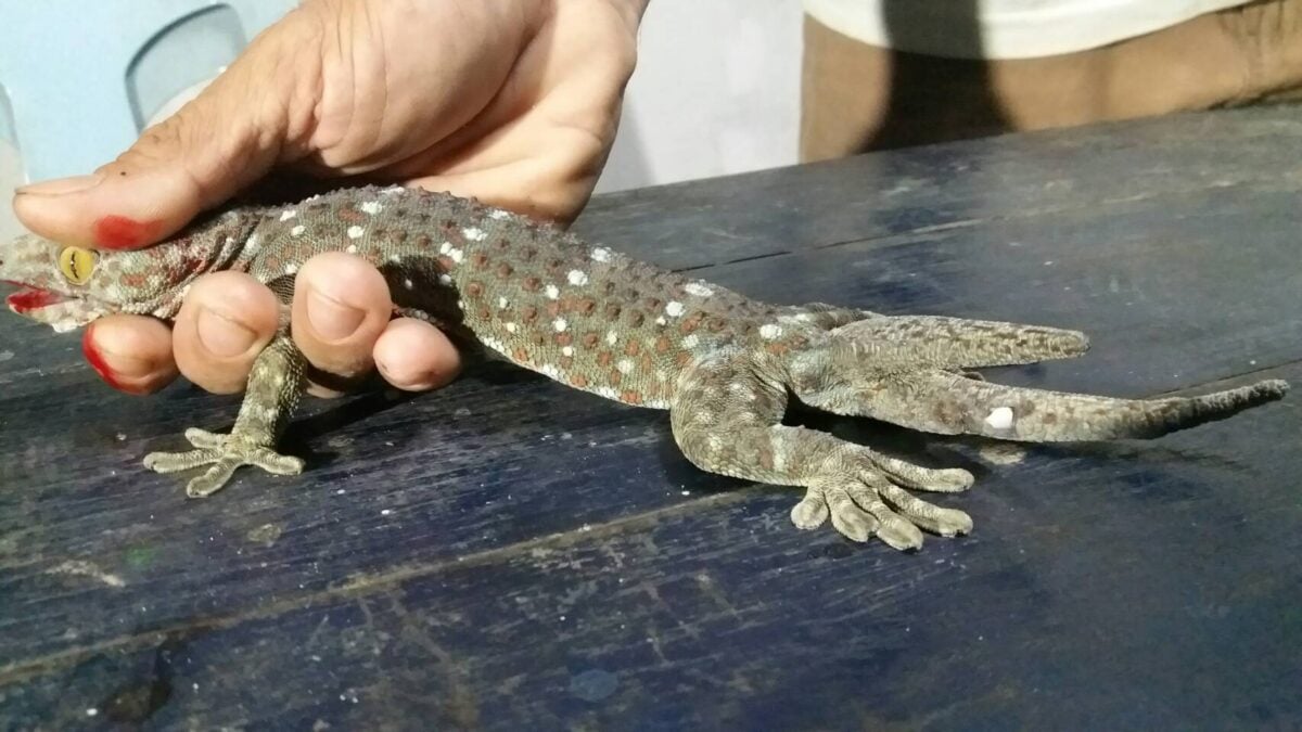 นายเด่นฯ เล่าให้ผู้สื่อข่าวฟังอีกว่าที่บ้านตนเองตามปกติก็มีตุ๊กแกมาอาศัยอยู่ตามผนังบ้านก็ปล่อยให้อยู่ไป คนในบ้านก็ไม่มีใครไปกวน และไม่มีคนกลัว แต่ตอนหัวค่ำวันนี้ สังเกตว่าตุ๊กแกเหมือนจะมีหางผิดไปจากตุ๊กแกทั่วไป เลยเข้าไปสังเกตใกล้ๆ เห็นหางเป็นเส้นคู่ มีสองหาง ไม่เหมือนที่เคยเป็นข่าวออกทีวีบ่อยๆ ที่เป็นหางแฉกปลาย ตัวนี้เป็นสองหางตัวจริง ออกมาแบบธรรมชาติ เลยลองจับดู พบว่าเชื่องมากไม่หนี ไม่กลัวคน เลยจับมาให้ผู้สื่อข่าวดูของแปลก ซึ่งตุ๊กแก ตัวนี้ ตนเองก็คงจะปล่อยให้อยู่ที่เดิม ยังไม่ทราบว่าตุ๊กแกเป็นตัวผู้ตัวหรือตัวเมีย คงเป็นเรื่องธรรมชาติเกิดขึ้นเอง ตัวอื่นก็ไม่เห็นมีหางแบบนี้ อาจเป็นสัตว์มงคลที่เกิดกับบ้าน อาจจะมาให้โชคลาภแก่คนในบ้านก็เป็นได้ ซึ่งตนจะดูแลปล่อยให้อาศัยอยู่ในบ้านหลังนี้ต่อไป