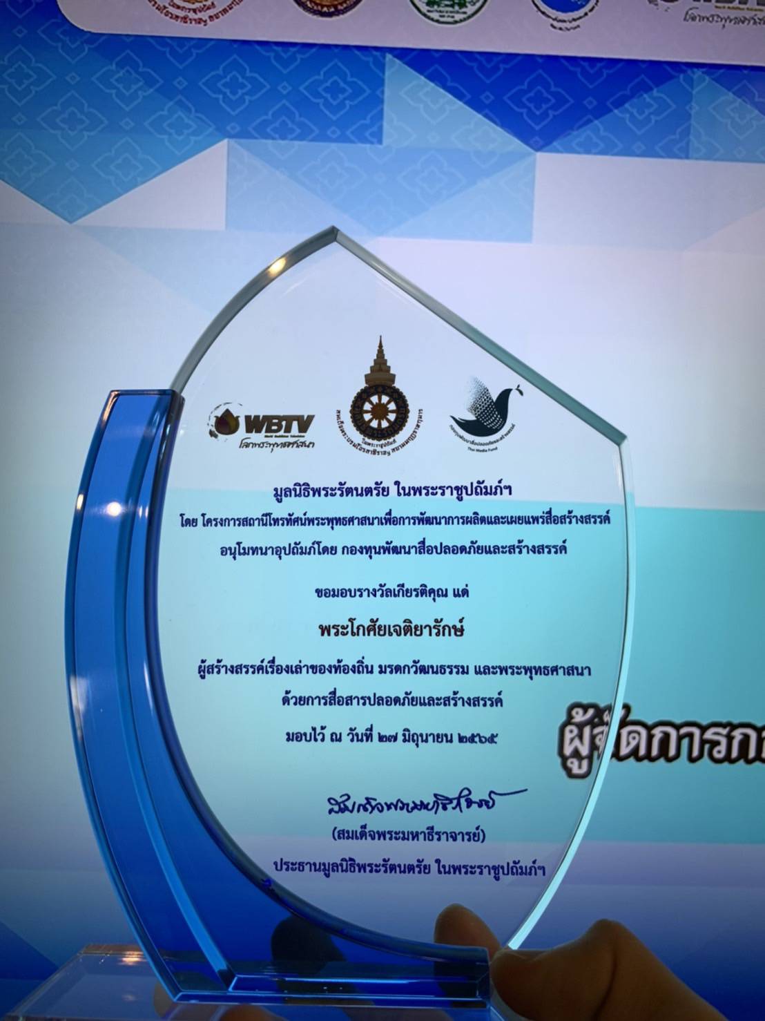 ผู้สื่อข่าวแจ้งว่า วันนี้ 27 มิ.ย. 65 เวลา 09.30 น. พระโกศัยเจติยารักษ์ รองเจ้าคณะจ.แพร่ เจ้าอาวาสวัดพระธาตุช่อแฮ พระอารามหลวง เข้ารับโล่รางวัลผู้สร้างสรรค์เรื่องเล่าของท้องถิ่น มรดกวัฒนธรรมและพระพุทธศาสนา ด้วยการสื่อสารปลอดภัยและสร้างสรรค์ ของมูลนิธิพระรัตนตรัย ในพระราชูปถัมภ์ สมเด็จพระบรมโอรสาธิราชฯ สยามมกุฎราชกุมาร โดยเจ้าประคุณสมเด็จพระมหาธีราจารย์ ประธานมูลนิธิพระรัตนตรัย ในพระราชูปถัมภ์ ประทานโล่เกียรติคุณ ณ วัดพระเชตุพนวิมลมังคลาราม ราชวรวิหาร กทม.และเข้าร่วมประชุมมหกรรมสื่อสรรค์สรรค์กับงานเผยแผ่พระพุทธศาสนา