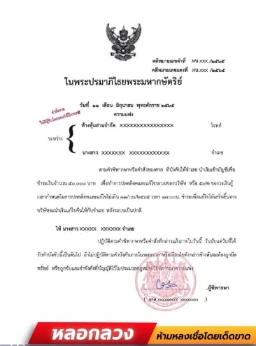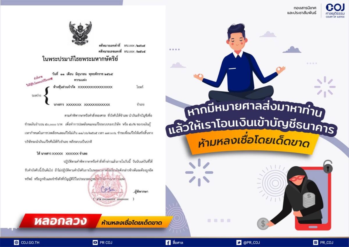 โดยล่าสุด หน่วยงานกระบวนการยุติธรรม อีกหน่วยงาน ก็ออกมาแจ้งเตือนประชาชน ผ่าน “เพจสื่อศาล” ซึ่งเป็นเพจในการประชาสัมพันธ์ให้บริการข้อมูลข่าวสารของศาลยุติธรรมไปยังบุคลากรภายในองค์กรและสังคม ได้ออกคำเตือนสังคมเช่นกัน เนื่องจาก แก๊งมิจฉาชีพ ได้มีการออกแบบ “หมายศาลปลอม” พร้อมกับแจ้งให้ผู้ที่มีชื่อในหมายศาลทำการโอนเงิน เข้าบัญชีของแก๊งมิจฉาชีพ !!