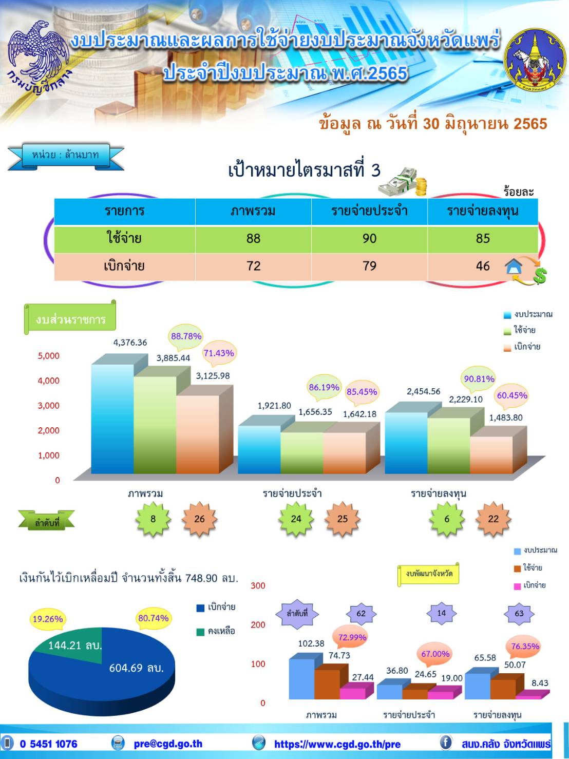 นายสมหวัง พ่วงบางโพ ผู้ว่าราชการจังหวัดแพร่ชี้แจงผลการใช้จ่ายงบประมาณรายจ่ายประจำปีงบประมาณ 2565 ไตรมาสที่ 3 (เม.ย.-มิ.ย. 65) ได้แก่