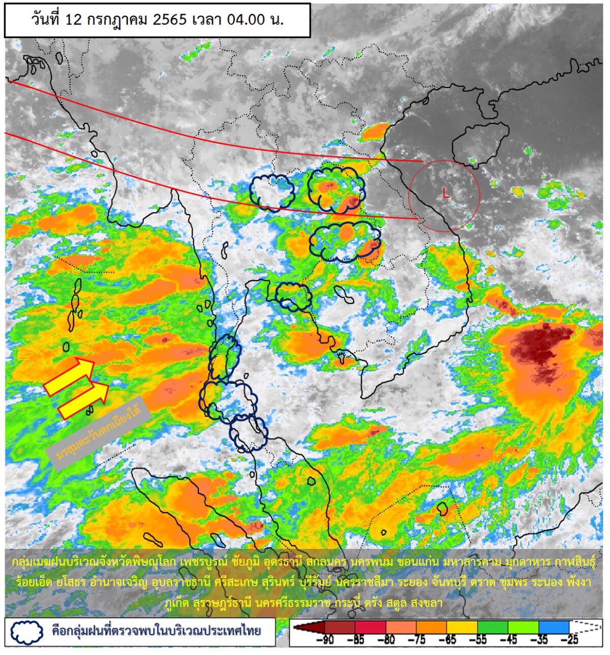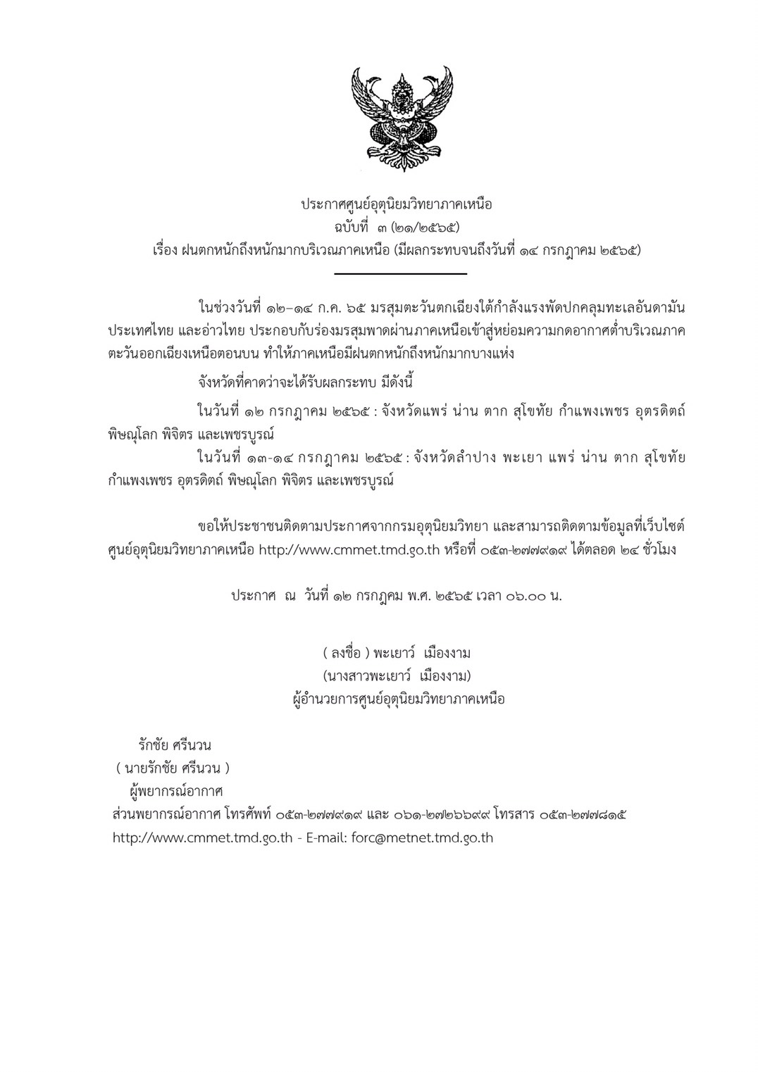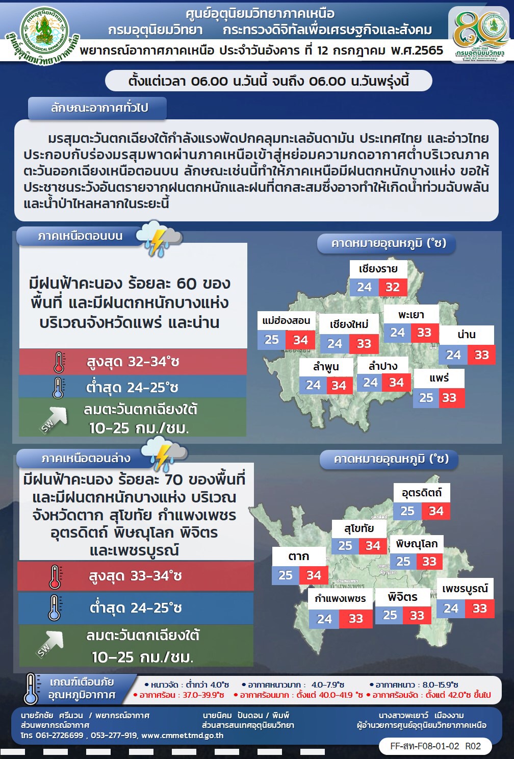 ลักษณะอากาศทั่วไป พยากรณ์อากาศ 24 ชั่วโมงข้างหน้า มรสุมตะวันตกเฉียงใต้กำลังแรงพัดปกคลุมทะเลอันดามัน ประเทศไทย และอ่าวไทย ประกอบกับร่องมรสุมพาดผ่านภาคเหนือ และภาคตะวันออกเฉียงเหนือตอนบน เข้าสู่หย่อมความกดอากาศต่ำ บริเวณภาคตะวันออกเฉียงเหนือตอนบน ลักษณะเช่นนี้ทำให้ภาคเหนือ ภาคตะวันออกเฉียงเหนือ ภาคกลาง ภาคตะวันออก และภาคใต้ มีฝนตกหนักถึงหนักมากบางแห่ง ขอให้ประชาชนบริเวณดังกล่าว ระวังอันตรายจากฝนตกหนักถึงหนักมากและฝนที่ตกสะสม ซึ่งอาจทำให้เกิดน้ำท่วมฉับพลันและน้ำป่าไหลหลากในระยะนี้