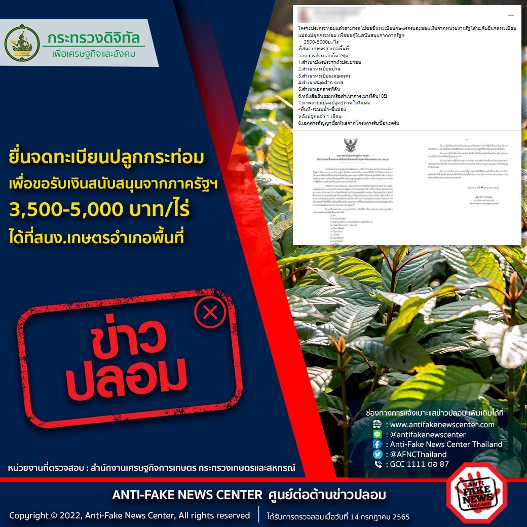ข่าวปลอม!!!ยื่นจดทะเบียนปลูกกระท่อม เพื่อขอรับเงินสนับสนุนจากภาครัฐฯ 3,500-5,000 บาท/ไร่ ได้ที่สนง.เกษตรอำเภอพื้นที่