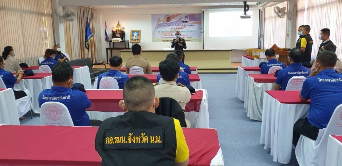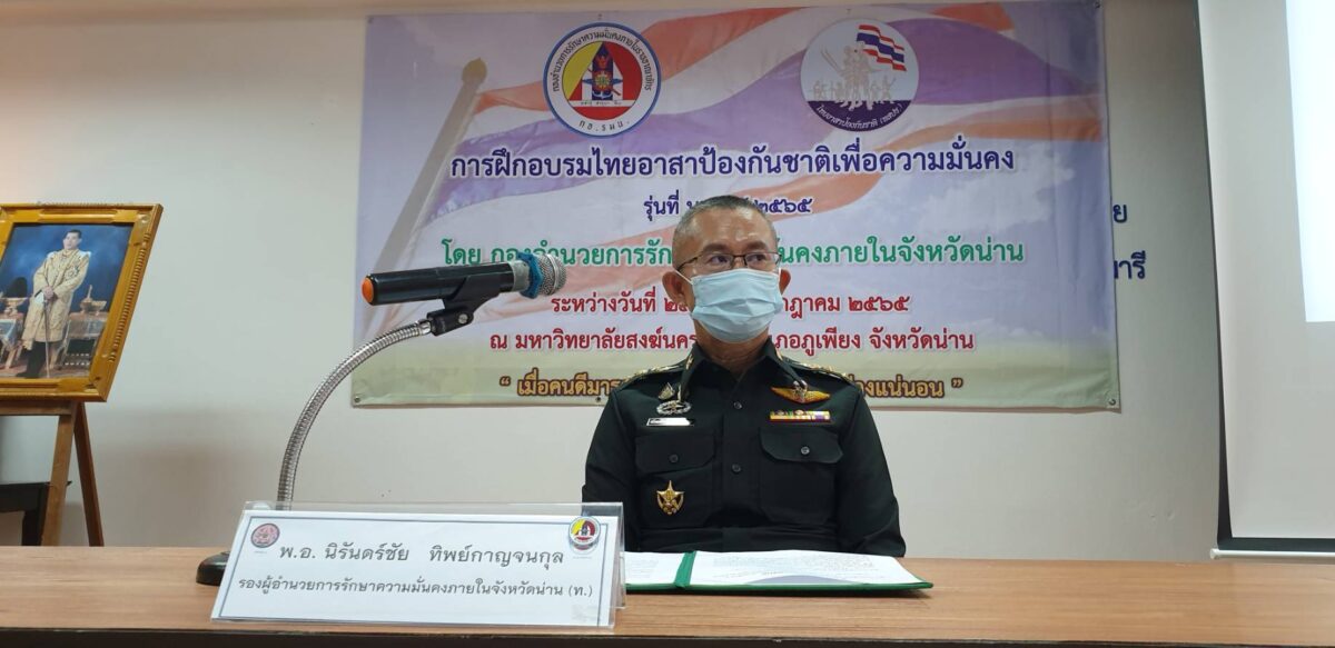 พันเอกนิรันดร์ชัย ทิพย์กาญจนกุล กล่าวว่า การฝึกอบรมไทยอาสาป้องกันชาติเพื่อความมั่นคง รุ่นที่ นน.1/2565 ของจังหวัดน่าน วัตถุประสงค์ โดยกองอำนวยการรักษาความมั่นคงภายในจังหวัดน่านเราต้องการที่จะสร้างมวลชน กองอำนวยการรักษาความมั่นคงภายใน ราชอาณาจักรต้องการ ฟื้น การกระทำดั้งเดิมคือไทยอาสาป้องกันชาติ ซึ่งโดยปัจจุบันบริบททางด้านความมั่นคงก็จะเปลี่ยนไปจากในการฝึกอบรมครั้งนี้ เราได้ให้ความรู้กับผู้รับการฝึกอบรม ในด้านภัยคุกคามอายจะรูปแบบใหม่และในพื้นที่จังหวัดน่านไม่ว่าจะเป็นเรื่องภัยพิบัติต่างๆยาเสพติดกับปัญหาความแตกแยกความสามัคคีหรือปัญหาต่างๆที่เกิดขึ้นในรูปแบบใหม่ๆในชุมชนโดยเราใช้การขับเคลื่อนทุนปรัชญาเพื่อความมั่นคงมี 3ทุนก็คือทุนทางปัญญา ทุนทางสังคมและทุนทรัพย์ ซึ่งกระบวนการอบรมครั้งนี้เราได้ คัดเลือกพี่น้องประชาชน ในตำบลเป้าหมายเพื่อ เป็นตำบล มั่งคั่งยั่งยืน 6 ตำบลด้วยกันตำบลละ 4 คนก็รวมทั้งหมด 24 คน ซึ่งการอบรม วัตถุประสงค์ หลักก็คือ ให้ผู้อบรม สามารถทำแผนเพื่อสร้างปัญหาเป็นความ และทำแผนที่ปฏิบัติต่อท้ายสาเหตุและการแก้ไขแนวทางกิจกรรมที่จะต้องไปขับเคลื่อนในพื้นที่โดยใช้อุปกรณ์ที่ทั้ง 3 กลุ่มทุนปัญญาสังคมและ ทุนทรัพย์ เข้าไปขับเคลื่อนหลังจากที่ ได้อบรมรุ่นแรกไปแล้วก็จะเข้าไปทสปช.สมทบ ต้องขยายในชุมชนขึ้นไปและ เป้าหมายสุดท้ายเราต้องการให้พี่น้องประชาชน สามารถต้องการให้พี่น้องประชาชนแก้ไขปัญหา ในชุมชน ต่อไป
