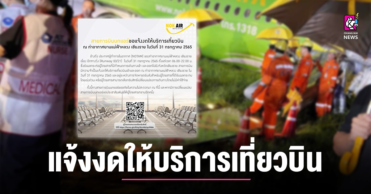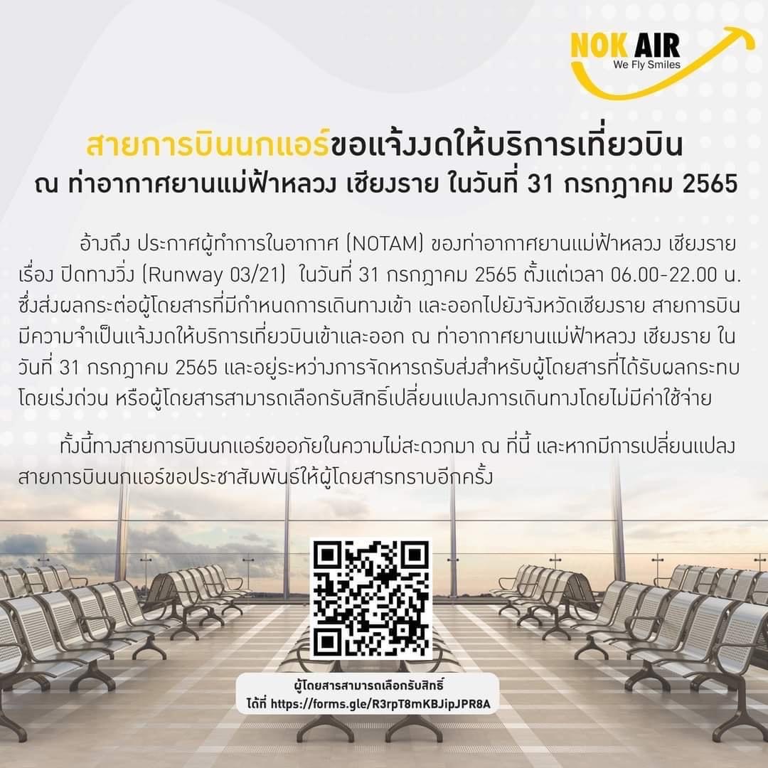 โดยประกาศล่าสุดจากสายการบินนกแอร์ มีข้อความว่า “สายการบินนกแอร์ขอแจ้งงดให้บริการเที่ยวบิน ณ ท่าอากาศยานแม่ฟ้าหลวงเชียงรายในวันที่ 31 กรกฎาคม 2565 อ้างถึงประกาศผู้ทำการในอากาศ (NOTAM) ของท่าอากาศยานแม่ฟ้าหลวงเชียงรายเรื่องปิดทางวิ่ง (Runway 03/21) ในวันที่ 31 กรกฎาคม 2565 ตั้งแต่เวลา 06.00-22.00 น. ซึ่งส่งผลกระต่อผู้โดยสารที่มีกำหนดการเดินทางเข้าและออกไปยังจังหวัดเชียงรายสายการบินมีความจำเป็นแจ้งงดให้บริการเที่ยวบินเข้าและออก ณ ท่าอากาศยานแม่ฟ้าหลวงเชียงรายในวันที่ 31 กรกฎาคม 2565 และอยู่ระหว่างการจัดหารถรับส่งสําหรับผู้โดยสารที่ได้รับผลกระทบโดยเร่งด่วนหรือผู้โดยสารสามารถเลือกรับสิทธิ์เปลี่ยนแปลงการเดินทางโดยไม่มีค่าใช้จ่ายทั้งนี้ทางสายการบินนกแอร์ขออภัยในความไม่สะดวกมา ณ ที่นี้และหากมีการเปลี่ยนแปลงสายการบินนกแอร์ขอประชาสัมพันธ์ให้ผู้โดยสารกราบอีกครั้ง”