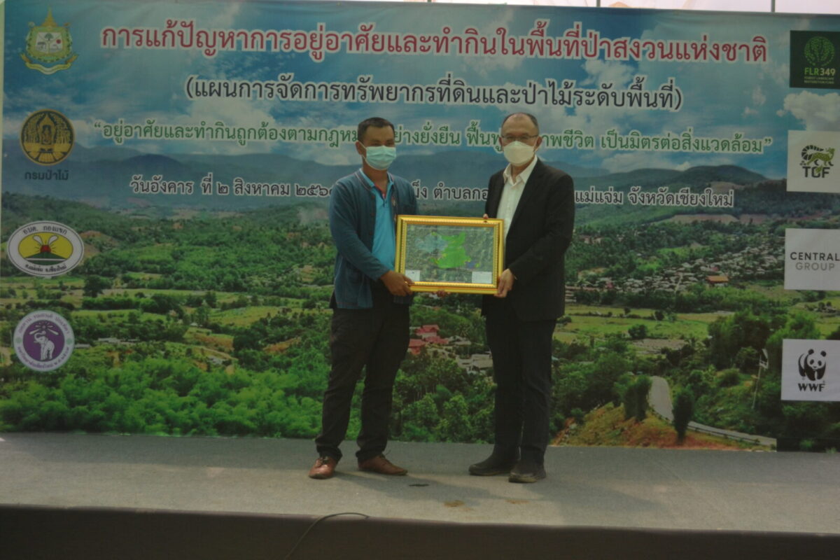 สำหรับกิจกรรมในวันนี้ได้มอบ “แผนการจัดการทรัพยากรที่ดินและป่าไม้ระดับพื้นที่” เพื่อขับเคลื่อนการแก้ไขปัญหาการอยู่อาศัยทำกินในพื้นที่ป่าสงวนแห่งชาติ เป็นตัวอย่างนำร่อง จำนวน 2 หมู่บ้าน รวมเนื้อที่ประมาณ 7,300 ไร่ ดังนี้ 1. บ้านผาผึ้ง หมู่ที่ 9 ตำบลกองแขก อำเภอแม่แจ่ม จังหวัดเชียงใหม่2. บ้านกองแขก หมู่ที่ 7 ตำบลกองแขก อำเภอแม่แจ่ม จังหวัดเชียงใหม่ พร้อมทั้งเป็นสักขีพยานในการมอบเงินกองทุนดูแลรักษาต้นไม้ให้แก่ราษฎรที่เข้าร่วมโครงการปลูกป่าสามอย่างประโยชน์สี่อย่างในพื้นที่แก้ไขปัญหาที่ดินทำกินและอยู่อาศัยในพื้นที่ป่าสงวนแห่งชาติตามนโยบายรัฐบาลจากกองทุน FLR 349 และมอบกล้าไม้มีค่าเศรษฐกิจเพื่อให้ราษฎรนำไปปลูกในพื้นที่ คทช. ต่อไป