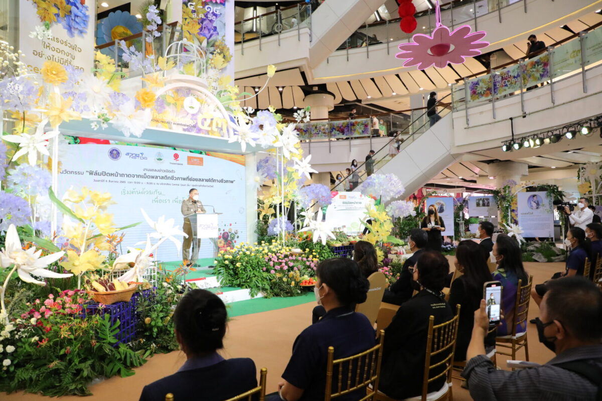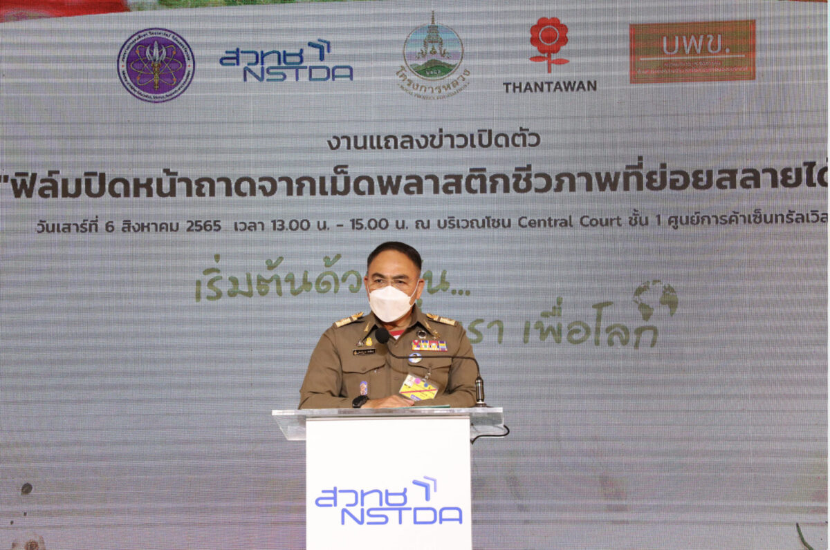 วันที่ 6 สิงหาคม 2565 ณ บริเวณโซน เซ็นทรัล คอร์ต (Central Court) ชั้น 1 ศูนย์การค้าเซ็นทรัลเวิลด์ ราชประสงค์ กรุงเทพฯ : ดร.ณรงค์ ศิริเลิศวรกุล ผู้อำนวยการสำนักงานพัฒนาวิทยาศาสตร์และเทคโนโลยีแห่งชาติ (สวทช.) แถลงข่าวเปิดตัวนวัตกรรม ‘ฟิล์มปิดหน้าถาดจากเม็ดพลาสติกชีวภาพที่ย่อยสลายได้ทางชีวภาพ’ เริ่มต้นด้วยกันเพื่อเราเพื่อโลก โดยมี พลเอก กัมปนาท รุดดิษฐ์ ประธานกรรมการบริหารมูลนิธิโครงการหลวง ศ.ดร.อาภาณี เหลืองนฤมิตชัย ประธานอนุกรรมการแผนงานกลุ่มพลังงาน เคมีและวัสดุชีวภาพ หน่วยบริหารและจัดการทุนด้านการเพิ่มความสามารถในการแข่งขันของประเทศ (บพข.) และนายเดชบดินทร์ เหรียญทรัพย์ดี รองประธานเจ้าหน้าที่บริหาร บริษัท ทานตะวันอุตสาหกรรม จำกัด (มหาชน) ร่วมแถลงข่าว ซึ่งภายในงานมีการเปิดตัว ฟิล์มปิดหน้าถาดจากเม็ดพลาสติกชีวภาพที่ย่อยสลายได้ทางชีวภาพที่นำไปบรรจุผักสลัดพร้อมทานของมูลนิธิโครงการหลวง วางจำหน่ายให้ประชาชนที่เข้ามาซื้อผลิตภัณฑ์คุณภาพระดับพรีเมียม สินค้าผลผลิตทางการเกษตร ที่ปลูกโดยชาวเขาบนพื้นที่สูงภายในงานโครงการหลวง 53 (Royal Project 53) ซึ่งมูลนิธิโครงการหลวงและพันธมิตรจัดขึ้นระหว่างวันที่ 4-14 สิงหาคม 2565 นี้