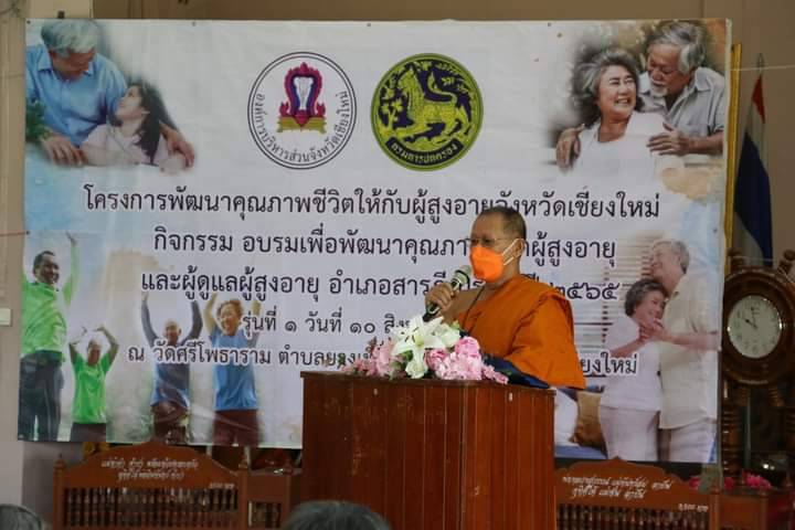 องค์การบริหารส่วนจังหวัดเชียงใหม่ ร่วมกับอำเภอสารภี จัดกิจกรรมอบรมเพื่อพัฒนาคุณภาพชีวิตผู้สูงอายุและผู้ดูแลผู้สูงอายุอำเภอสารภี ระหว่างวันที่ 10 – 11 สิงหาคม 2565 เพื่อสร้างความตระหนักในการเตรียมความพร้อมสู่สังคมสูงวัย ด้านเศรษฐกิจ สุขภาพสังคม สภาพแวดล้อม และเทคโนโลยี ให้แก่ผู้สูงอายุอำเภอสารภี เสริมสร้างศักยภาพความเข้มแข็งให้กับผู้สูงอายุในการสืบทอดภูมิปัญญาท้องถิ่น โดยมีนางวิภาวัลย์ วรพุฒิพงค์ รองนายกองค์การบริหารส่วนจังหวัดเชียงใหม่ เป็นประธานเปิดการอบรม พร้อมด้วยสมาชิกสภาองค์การบริหารส่วนจังหวัดเชียงใหม่ ,ปลัดอำเภอ หัวหน้ากลุ่มงานทะเบียนและบัตรอำเภอสารภี และประธานสาขาสมาคมสภาผู้สูงอายุ แห่งประเทศไทย ประจำจังหวัดเชียงใหม่ เข้าร่วมพิธีเปิด ทั้งนี้พระสมุห์คเชนทร์เทพ สุเทโว เจ้าอาวาสวัดป่าเป้าได้บรรยายให้ความรู้ในหัวข้ออยู่อย่างไรไกลโรค ณ วัดศรีโพธาราม ตำบลยางเนิ้ง อำเภอสารภี จังหวัดเชียงใหม่