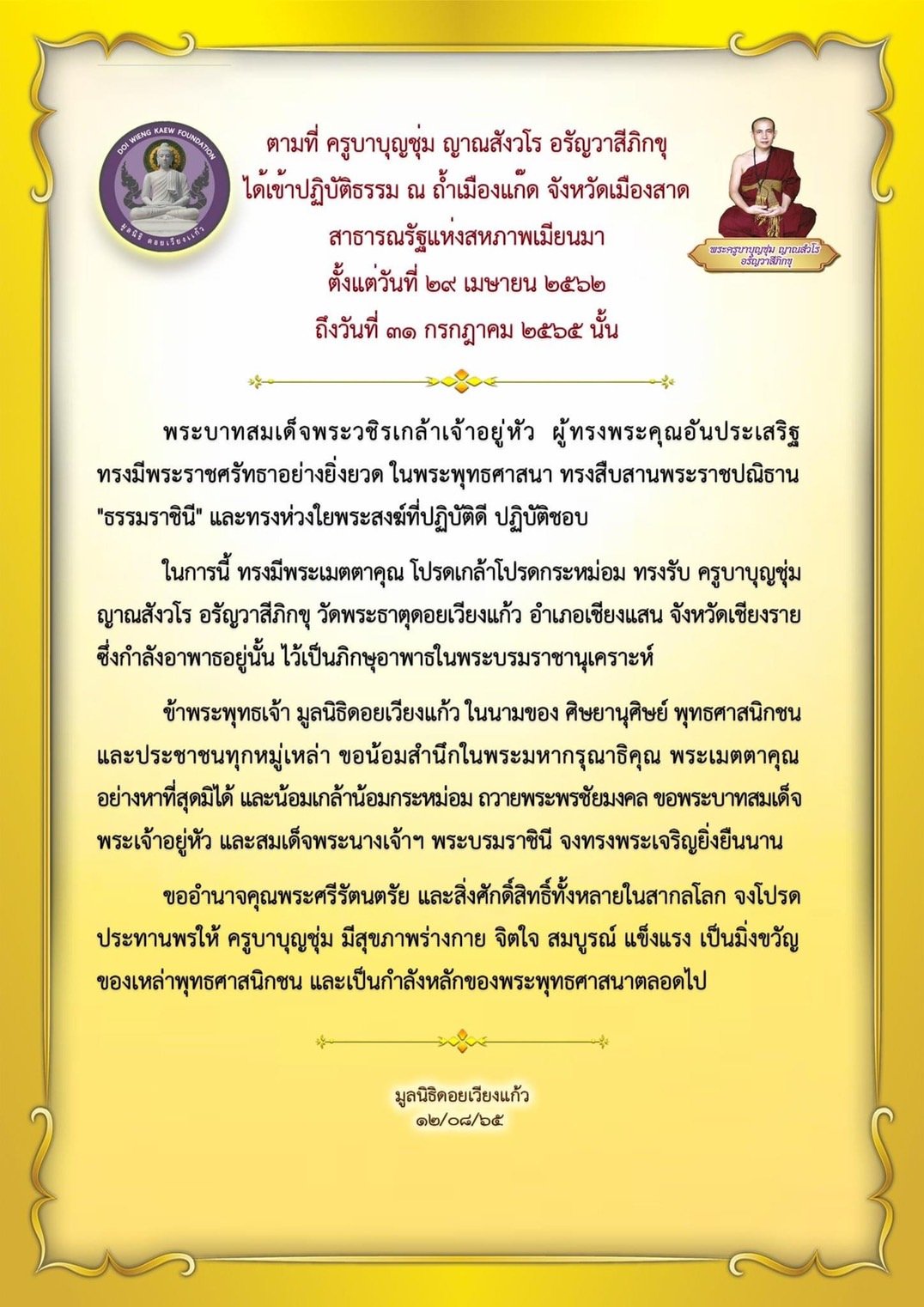 มูลนิธิดอยเวียงแก้ว ในนามของ ศิษยานุศิษย์ พุทธศาสนิกชน และประชาชนทุกหมู่เหล่า ขอน้อมสำนึกในพระมหากรุณาธิคุณ พระเมตตาคุณ อย่างหาที่สุดมิได้ และน้อมเกล้าน้อมกระหม่อม ถวายพระพรชัยมงคล ขอพระบาทสมเด็จพระเจ้าอยู่หัว และสมเด็จพระนางเจ้าฯ พระบรมราชินี จงทรงพระเจริญยิ่งยืนนาน