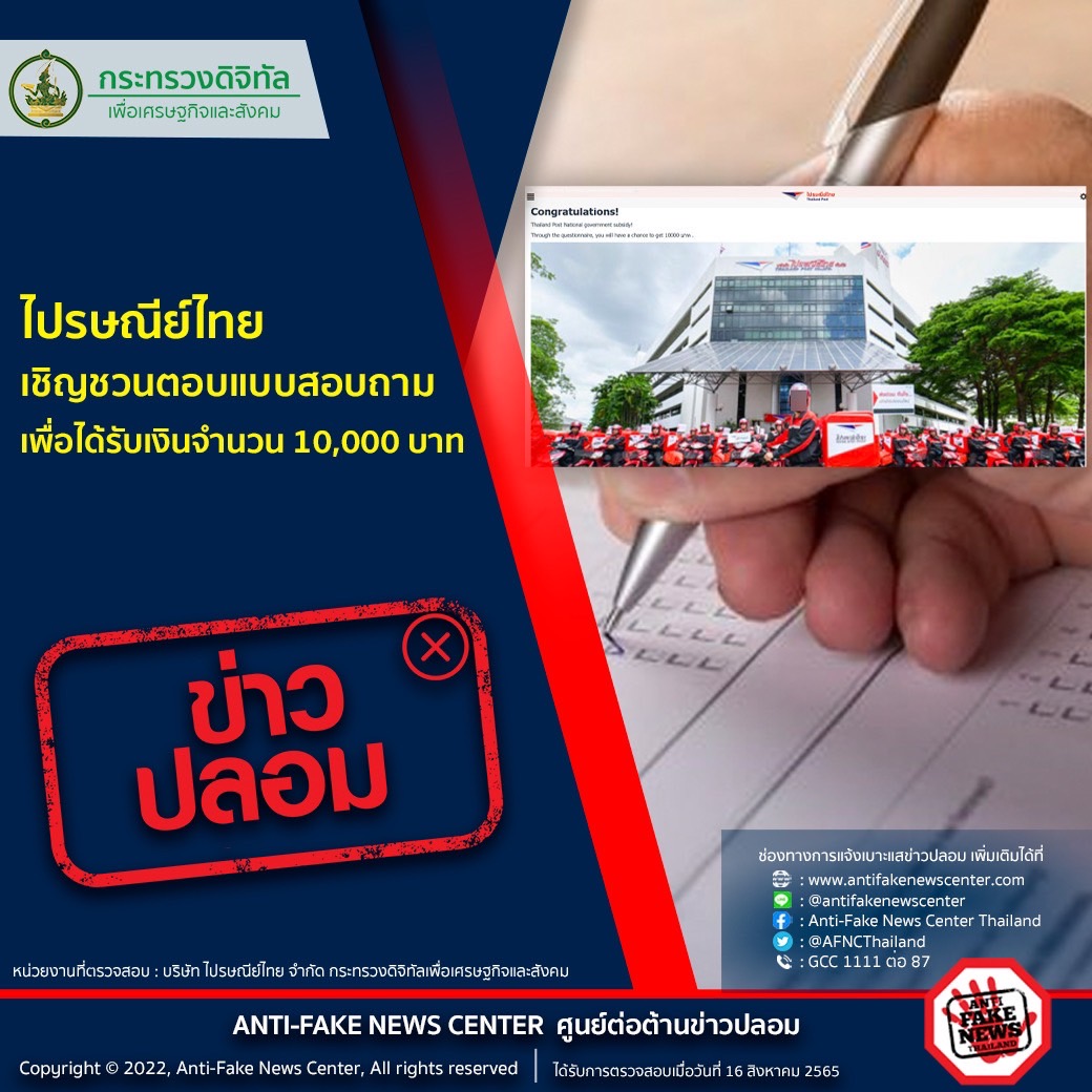 กรณีที่มีการเผยแพร่ข้อมูลเกี่ยวกับประเด็นไปรษณีย์ไทยเชิญชวนตอบแบบสอบถามเพื่อได้รับเงินจำนวน 10,000 บาท ทางศูนย์ต่อต้านข่าวปลอม กระทรวงดิจิทัลเพื่อเศรษฐกิจและสังคม ได้ดำเนินการตรวจสอบข้อเท็จจริงโดยบริษัท ไปรษณีย์ไทย จำกัด กระทรวงดิจิทัลเพื่อเศรษฐกิจและสังคม พบว่าประเด็นดังกล่าวนั้น เป็นข้อมูลเท็จ