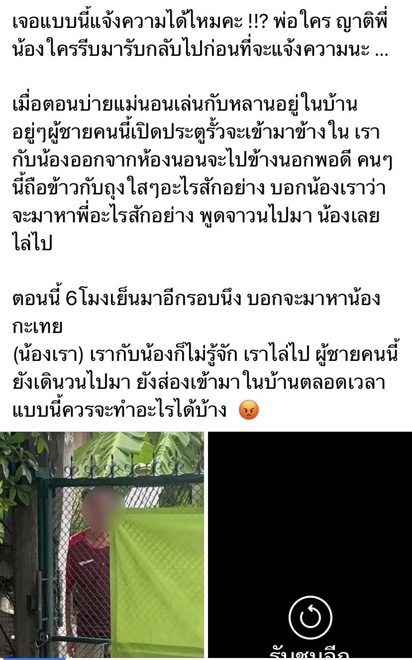 สาวผวาชายแปลกหน้าเดินป้วนเปี้ยนหน้าบ้าน เกาะกรงรั้ว พยายามจะเข้ามาหา ล่าสุดนำคลิปหลักฐานเข้าแจ้งความ ตร.หวั่นถูกบุกรุกเข้ามาทำร้ายคนในบ้าน