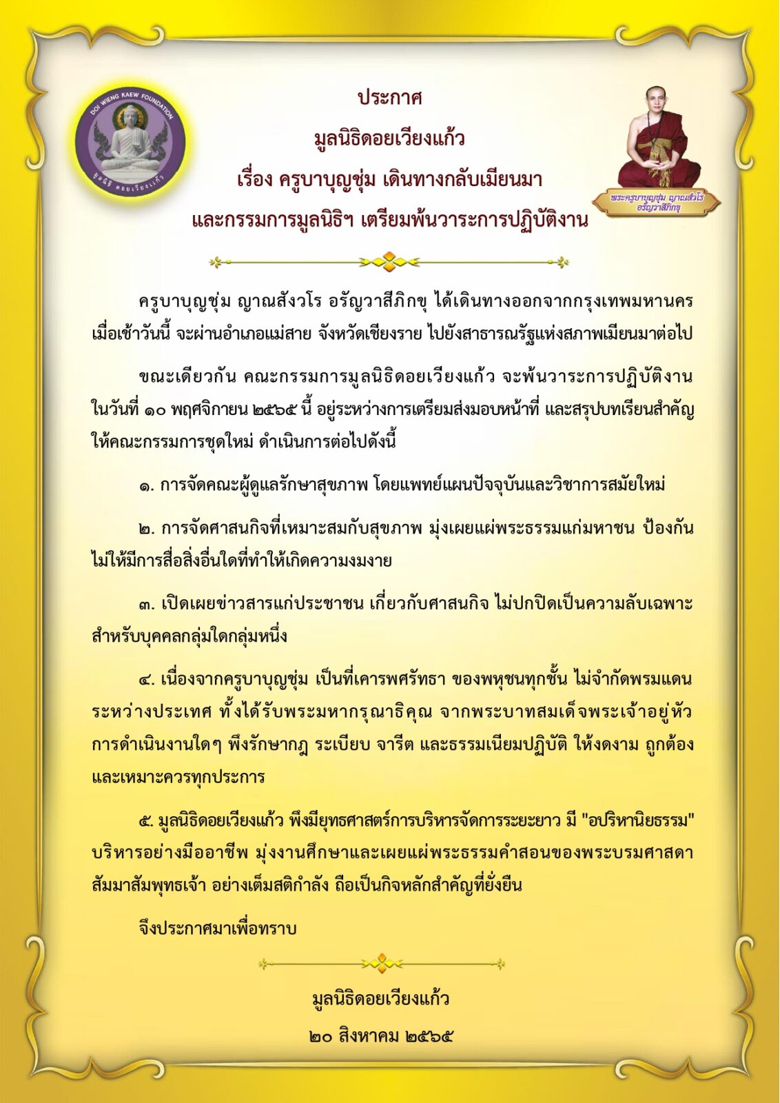 ต่อมาได้มีประกาศของมูลนิธิดอยเวียงแก้วออกมา เรื่อง ครูบาบุญชุ่ม เดินทางกลับเมียนมา และกรรมการมูลนิธิฯ เตรียมพ้นวาระการปฏิบัติหน้าที่ว่า