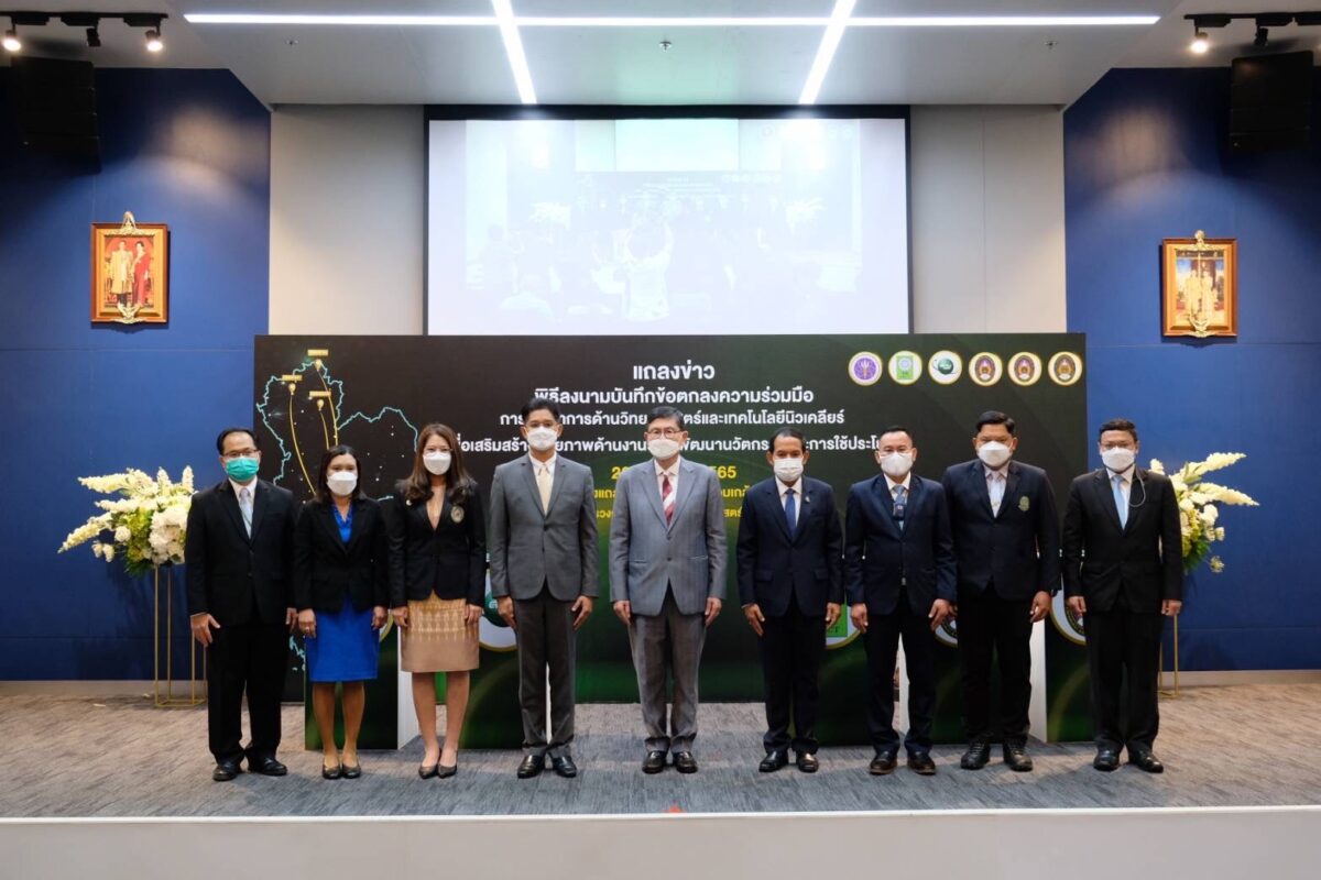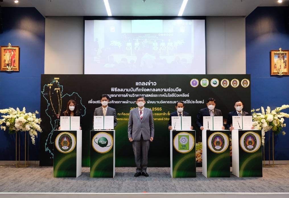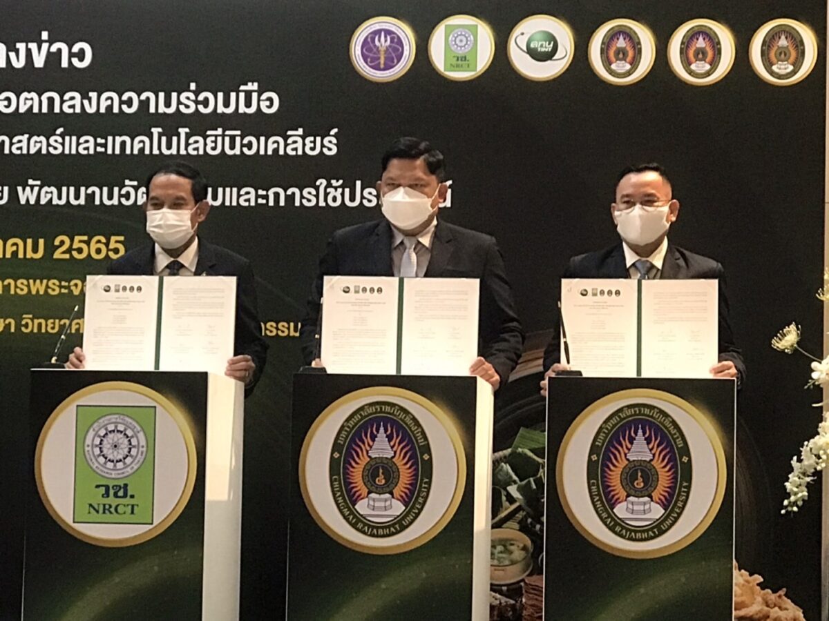 วันที่ 22 สิงหาคม 2565 ผู้ช่วยศาสตราจารย์สุรศักดิ์ นุ่มมีศรี รองอธิการบดี พร้อมด้วย อาจารย์ ดร.อัครสิทธิ์ บุญส่งแท้ ผู้อำนวยการสถาบันวิจัยและพัฒนา มหาวิทยาลัยราชภัฏเชียงใหม่ ร่วมพิธีลงนามบันทึกข้อตกลงความร่วมมือ เรื่อง การบูรณาการด้านวิทยาศาสตร์และเทคโนโลยีนิวเคลียร์ เพื่อเสริมสร้างศักยภาพด้านงานวิจัย พัฒนานวัตกรรมและการใช้ประโยชน์” โดยความร่วมมือ 5 หน่วยงานหลัก นำโดย สถาบันเทคโนโลยีนิวเคลียร์แห่งชาติ (องค์การมหาชน) หรือ สทน. พร้อมด้วย สำนักงานการวิจัยแห่งชาติ (วช.) มหาวิทยาลัยราชภัฏเชียงใหม่ มหาวิทยาลัยราชภัฏเชียงราย และมหาวิทยาลัยราชภัฏกำแพงเพชร ทั้งนี้ได้รับเกียรติจาก ศาสตราจารย์พิเศษ ดร.เอนก เหล่าธรรมทัศน์ รัฐมนตรีว่าการกระทรวงการอุดมศึกษา วิทยาศาสตร์ วิจัยและนวัตกรรม เป็นประธานในพิธีลงนาม มี รองศาสตราจารย์ ดร.ธวัชชัย อ่อนจันทร์ ผู้อำนวยการ สทน. นายอเนก บำรุงกิจ รองผู้อำนวยการ วช. และผู้บริหารมหาวิทยาลัยราชภัฏ เข้าร่วมงาน ณ ห้องแถลงข่าว อาคารพระจอมเกล้า ชั้น 1 สำนักงานปลัดกระทรวงการอุดมศึกษา วิทยาศาสตร์ วิจัยและนวัตกรรม กรุงเทพมหานคร