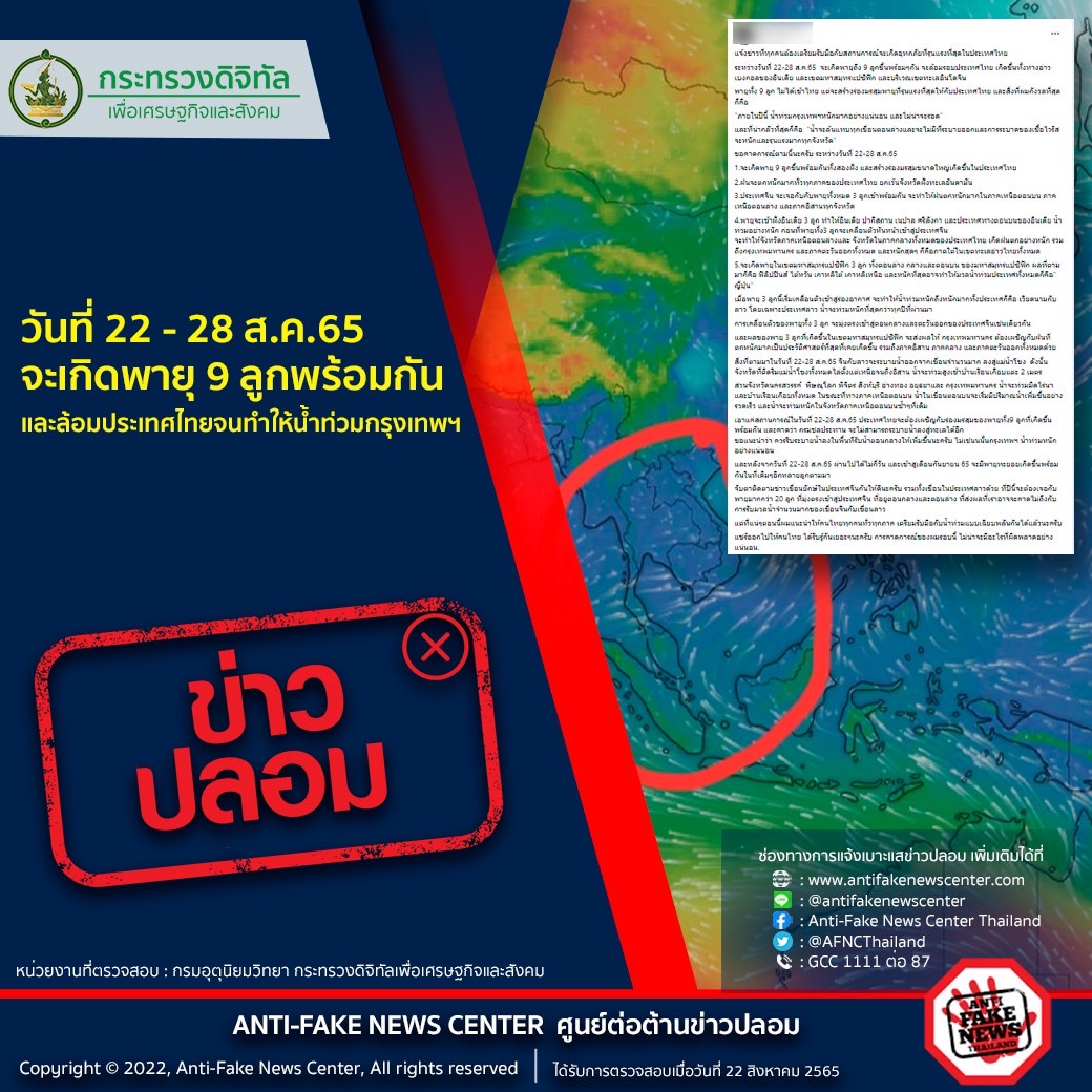 กรณีที่มีข้อมูลในสื่อออนไลน์ต่าง ๆ เกี่ยวกับประเด็นเรื่องวันที่ 22 – 28 ส.ค.65 จะเกิดพายุ 9 ลูกพร้อมกัน และล้อมประเทศไทยจนทำให้น้ำท่วมกรุงเทพฯ ทางศูนย์ต่อต้านข่าวปลอม กระทรวงดิจิทัลเพื่อเศรษฐกิจและสังคม ได้ดำเนินการตรวจสอบข้อเท็จจริงโดยทางกรมอุตุนิยมวิทยา กระทรวงดิจิทัลเพื่อเศรษฐกิจและสังคม พบว่าประเด็นดังกล่าวนั้น เป็นข้อมูลเท็จ
