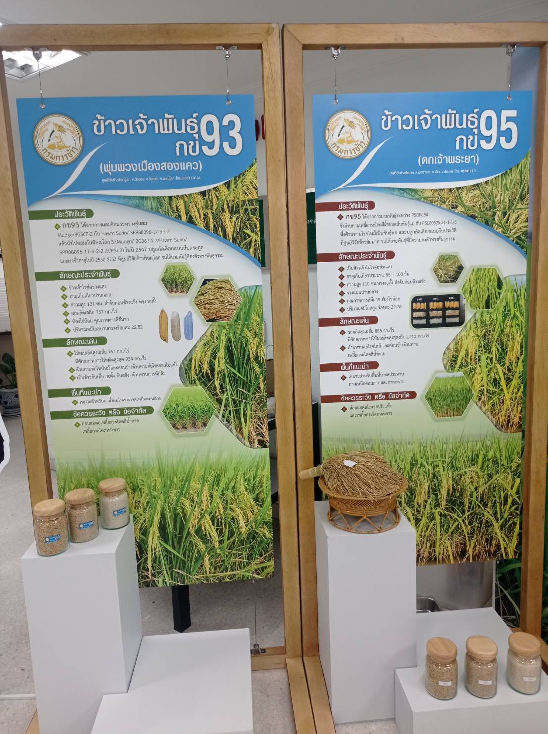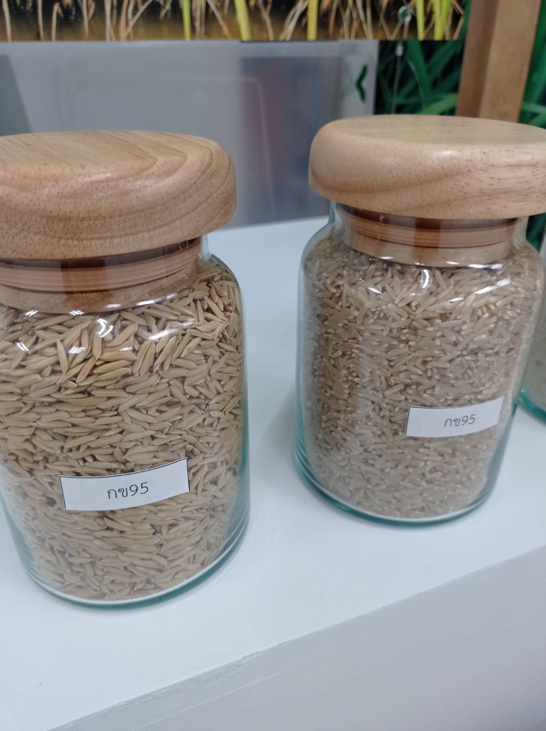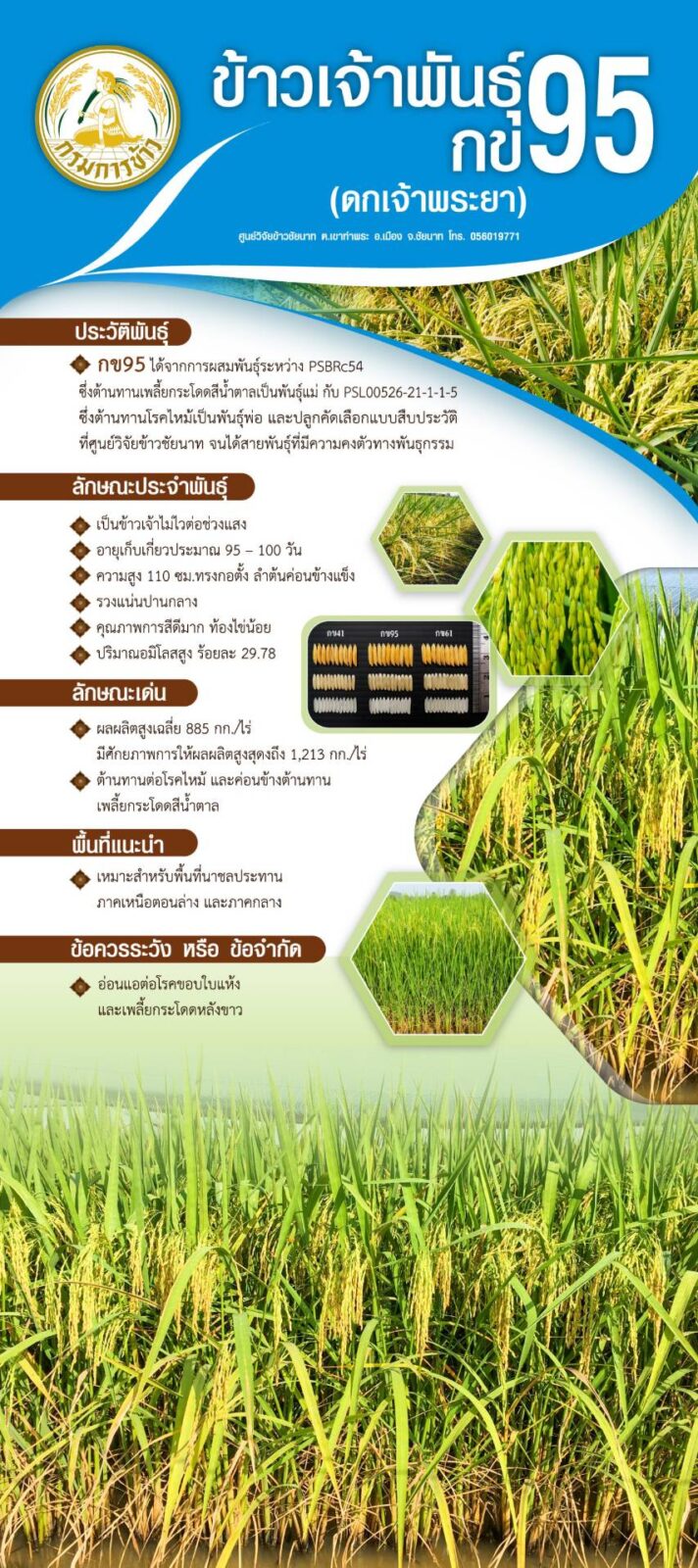 ในส่วนของพันธุ์ กข95 (ดกเจ้าพระยา) เป็นผลงานการพัฒนาจากศูนย์วิจัยข้าวชัยนาท เป็นข้าวขาวพื้นแข็ง มีลักษณะประจำพันธุ์ คือ เป็นข้าวเจ้านุ่มไม่ไวต่อช่วงแสง ความสูง 110 ซม. คุณภาพการสีดีมาก ท้องไข่น้อย มีปริมาณอมิโลสสูงร้อยละ 29.78 อายุการเก็บเกี่ยว 95 – 100 วัน มีลักษณะเด่น คือ ผลผลิตสูงเฉลี่ย 885 กก./ไร่ (มีศักยภาพการให้ผลผลิตสูงสุด 1,213 กก./ไร่) ต้านทานต่อโรคไหม้และค่อนข้างต้านทานเพลี้ยกระโดดสีน้ำตาล เหมาะสำหรับนาชลประทานถาคเหนือตอนล่าง และภาคกลาง แต่มีข้อจำกัดคือ อ่อนแอต่อโรคขอบใบแห้งและเพลี้ยกระโดดหลังขาว