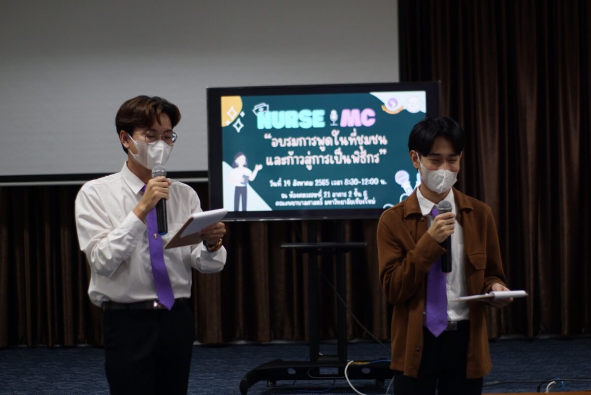 สโมสรนักศึกษา คณะพยาบาลศาสตร์ มหาวิทยาลัยเชียงใหม่ จัดโครงการอบรมและการประกวดการพูดในที่ชุมชนและการเป็นพิธีกร ประจำปี 2565 พิธีเปิดได้รับเกียรติจาก ผศ.ดร.ธานี แก้วธรรมานุกูล คณบดีคณะพยาบาลศาสตร์ฯ เป็นประธานกล่าวเปิดโครงการ โดยมี น.ส.ชนิดา แก้วผลึก ในฐานะนักศึกษาชั้นปีที่ 4 ผู้รับผิดชอบโครงการ กล่าวรายงาน วัตถุประสงค์เพื่อให้นักศึกษามีความรู้ ความเข้าใจเกี่ยวกับหลักการพูดพื้นฐานในที่ชุมชน เทคนิคในการเป็นพิธีกรที่ถูกต้อง เพื่อเสริมสร้างทักษะด้านการสื่อสารและบุคลิกภาพที่ดี สามารถนำไปปรับใช้ในวิชาชีพการพยาบาลได้อย่างเหมาะสม