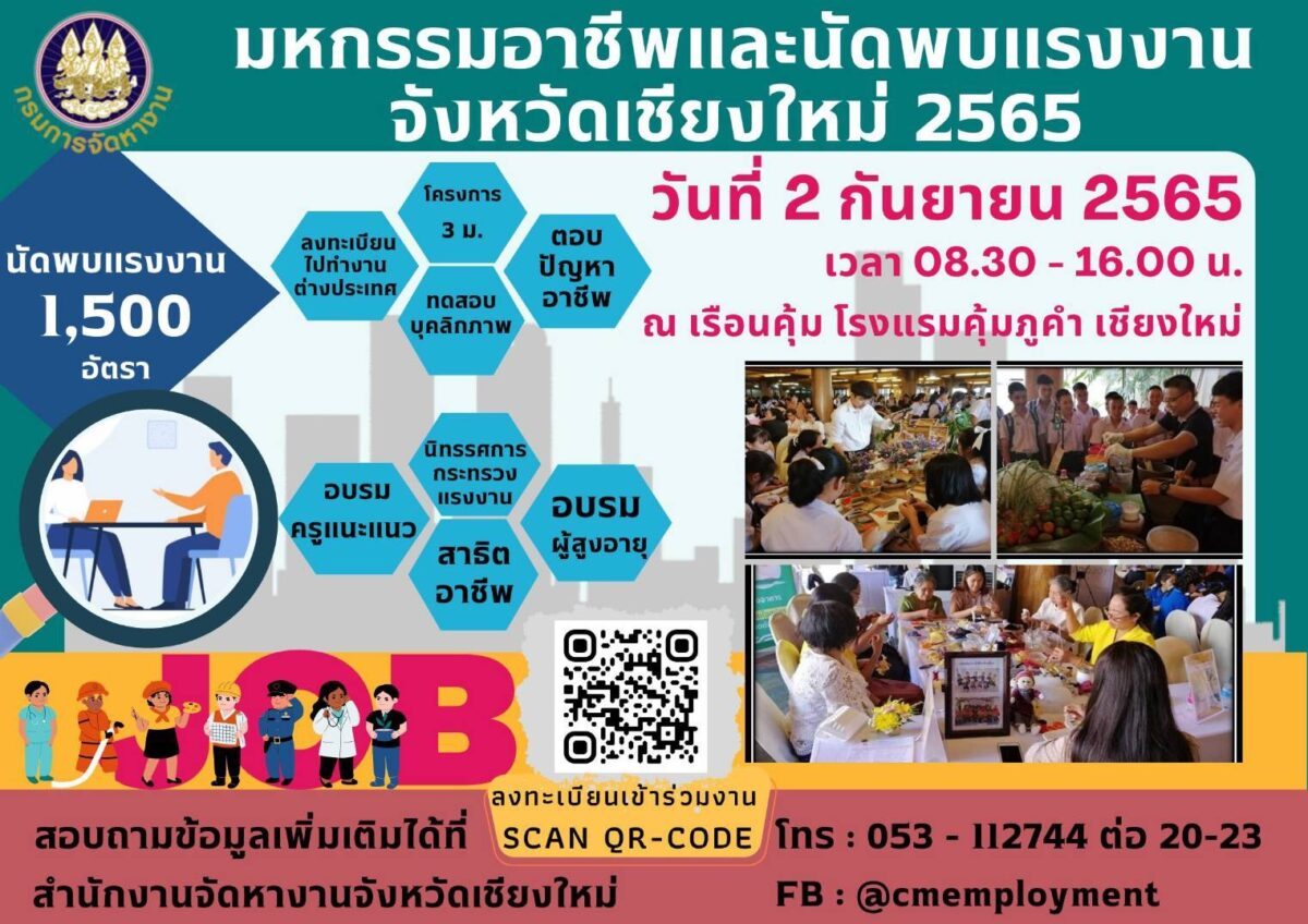 จัดหางานจังหวัดเชียงใหม่ จัดมหกรรมอาชีพและนัดพบแรงงานเชียงใหม่ ชี้ช่องทางเพิ่มรายได้..กับการฝึกอาชีพมากกว่า 10 อาชีพ และตำแหน่งงานมากกว่า 1,500 อัตรา 2 กันยายน 65 นี้ ที่โรงแรมคุ้มภูคำเชียงใหม่