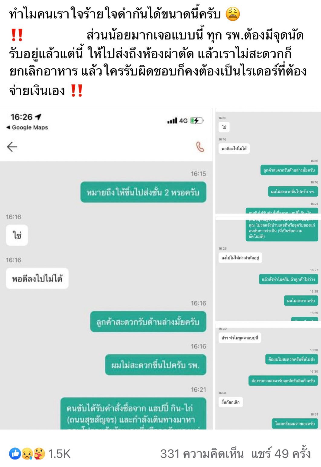 ขณะที่ต่อมา ทางเจ้าตัวได้นำเรื่องนี้มาโพสต์ลงโซเชียล ทำให้เกิดกระแสวิพากษ์วิจารณ์กันจำนวนมาก จากการที่ และจากการสอบถามทางด้าน นายณัฐดนัย สินเปียง อายุ 29 ปี พนักงานส่งอาหารค่ายหนึ่ง ที่โพสต์แชทการพูดคุยระหว่างเขากับลูกค้า ซึ่งเป็นเจ้าหน้าที่ในโรงพยาบาลเอกชนแห่งหนึ่งใน อ.เมืองเชียงใหม่ ในสื่อสังคมออนไลน์ เล่าว่า เรื่องนี้เกิดขึ้นช่วงบ่ายวันที่ 21 สิงหาคม ลูกค้าได้สั่งอาหารและให้ไปส่งที่โรงพยาบาล เมื่อไปถึงลูกค้าแจ้งให้ขึ้นไปส่งห้องผ่าตัดชั้นสอง แต่เขาแจ้งว่าไม่สะดวกขึ้นไปและขอให้ลงมารับอาหารที่จุดรับส่งด้านล่าง แต่ลูกค้ายืนยันระบุว่า “ลงไปไม่ได้ค่ะ ผ่าตัดอยู่” ก่อนที่จะยกเลิกออเดอร์ไปในที่สุดและทำให้ไรเดอร์ ต้องรับผิดชอบจ่ายเงินค่าอาหารเองเป็นเงิน 55 บาท