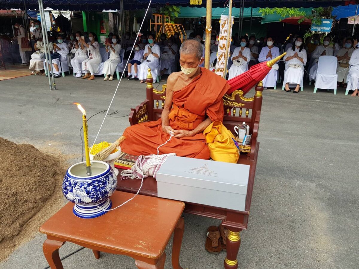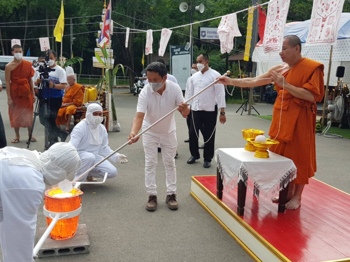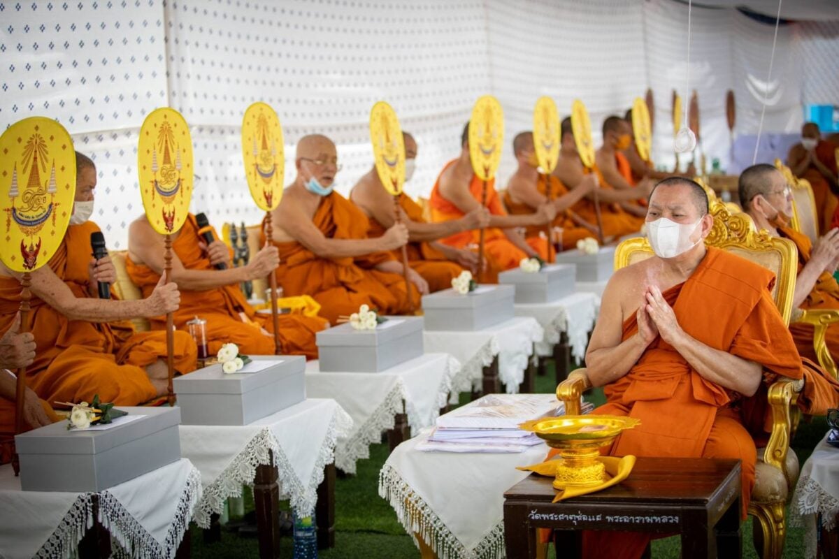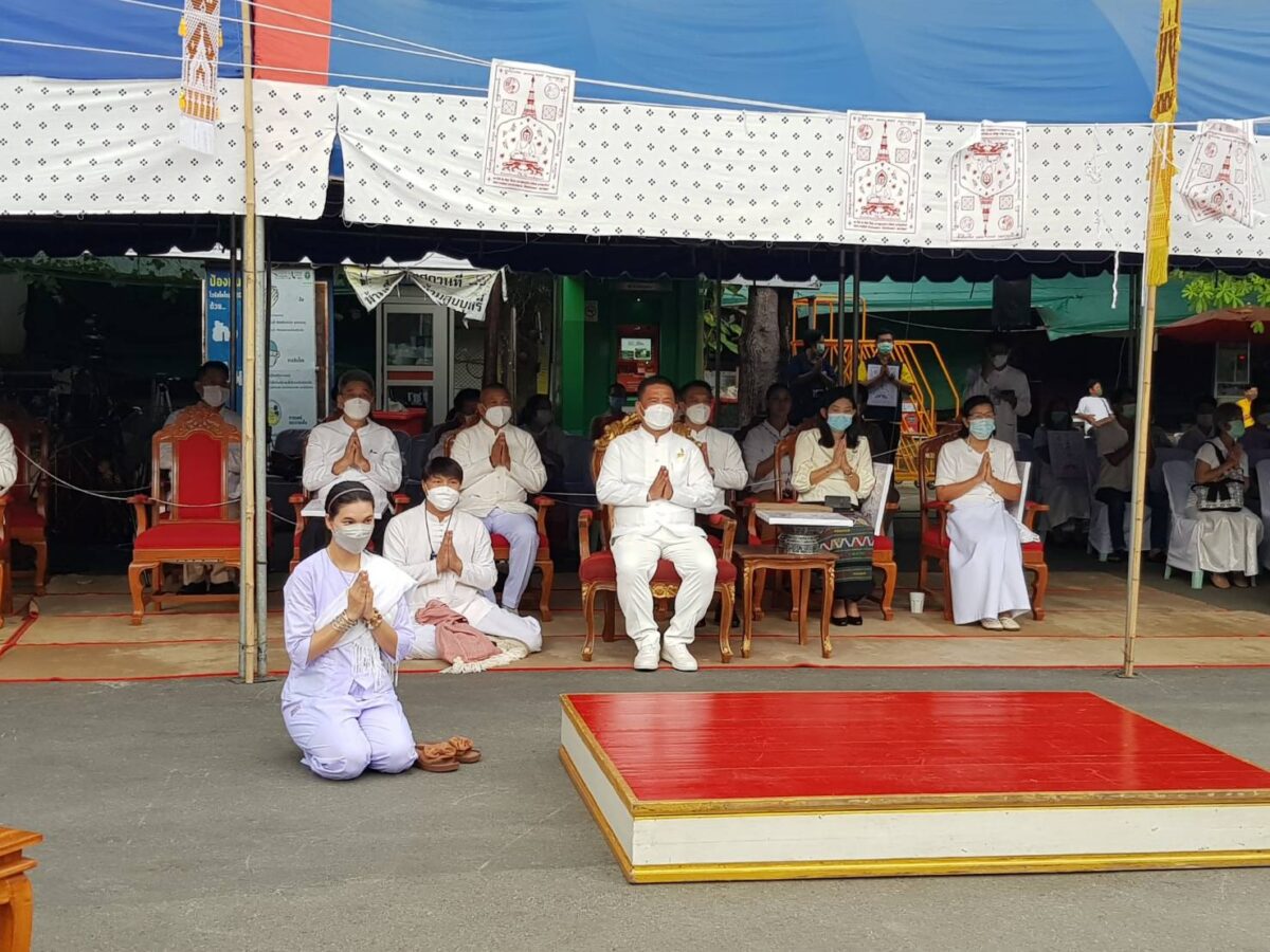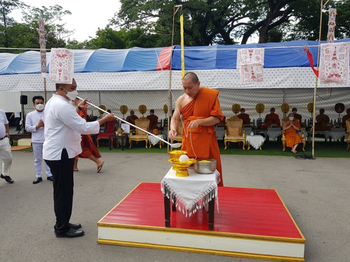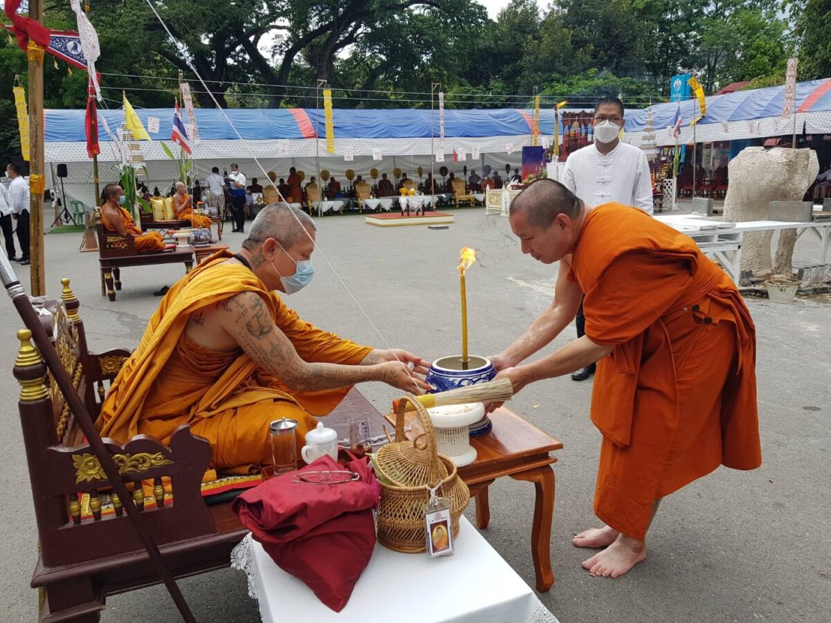 ต่อด้วย เวลา 11.19 น ฃ พระราชปัญญาภรณ์ รองเจ้าคณะภาค 6 วัดนางชี พระอารามหลวง กทม.นำพระมหาเถราจารย์ เจริญพระพุทธมนต์ ธัมมจักกัปปวัตนสูตร เสร็จแล้วโปรยข้าวตอกดอกไม้ และประพรหมน้ำพระพุทธมนต์ เงินแท่ง พระสงฆ์เจริญชยมงคลคาถา