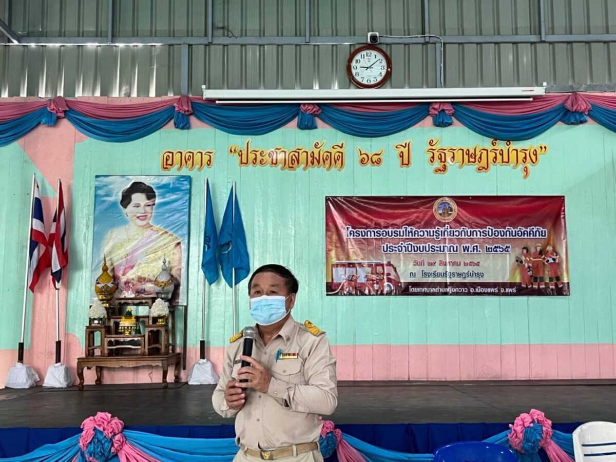 29 ส.ค. 65 นายอนุสรณ์ พรมรังกา ผอ.รร.รัฐราษฎร์บำรุง ผู้อำนวยการโรงเรียนรัฐราษฎร์บำรุง ตำบลทุ่งกวาว อำเภอเมือง จังหวัดแพร่ สังกัดสำนักงานเขตพื้นที่การศึกษาประถมศึกษา แพร่ เขต 1 ได้เปิดเผยกับผู้สื่อข่าวว่า จากกรณีมีข่าวทางสื่อสารมวลชนมาอย่างต่อเนื่อง ว่า กรณีเกิดเหตุเพลิงไหม้มักเกิดความเสียหายทั้งชีวิตและทรัพย์สินเป็นจำนวนมาก ประกอบกับกระทรวงศึกษาธิการมีนโยบาลโรงเรียนปลอดภัย ดังนั้นการสร้างองค์ความรู้และทักษะในการแก้ปัญหากรณีเกิดเพลิงไหม้ทั้งที่โรงเรียนและที่อยู่อาศัยของยักเรียนจึงเป็นสิ่งสำคัญอย่างยิ่ง ดังนั้น โรงเรียนได้ประสานขอความอนุเคราะห์จากเทศบาลตำบลทุ่งกวาวให้ดำเนินโครงการอบรมให้ความรู้เกี่ยวกับการป้องกันอัคคีภัยแก่นักเรียน ชั้น ป.1-6 จำนวน 98 คน