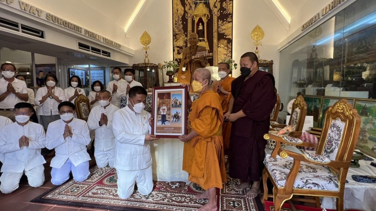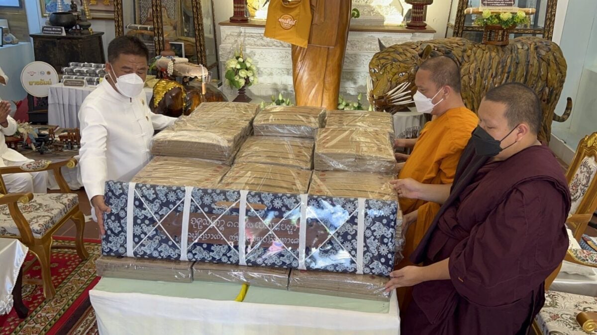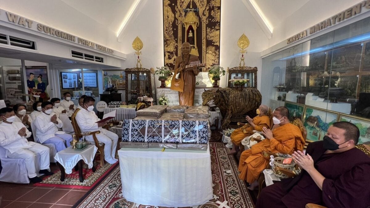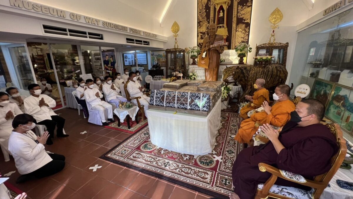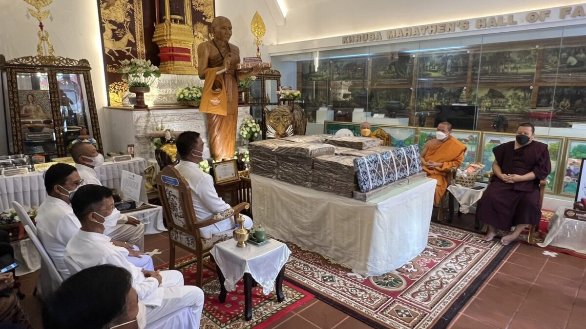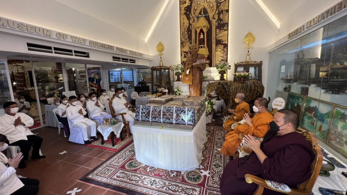 จากนั้น เวลา 15.30 น. ณ ขอชีวประวัติครูบามหาเถรวัดสูงเม่น นายสมหวัง พ่วงบางโพ ผู้ว่าราชการจังหวัดแพร่ ได้ถวายคัมภีร์ มหามูลนิพพานสูตร ฉบับปริวรรตและแปลจาก คัมภีร์ใบลานอักษรล้านนา ต้นฉบับวัดสูงเม่น พ.ศ 2307 ซึ่งเป็นฉบับเก่าแก่ที่สุดในล้านนา โดยเนื้อหาในคัมภีร์กล่าวถึง แนวทางปฏิบัติเพื่อความพ้นทุกข์ เข้าสู่มรรคผลนิพพาน ตามคติธรรมของพระพุทธศาสนา โดยได้ถวายทั้งหมดจำนวน 1,500 ผูก ไว้กับสถาบันอนุรักษ์คัมภีร์ใบลาน วัดสูงเม่น และจัดทำอีก 1.3 หมื่นผูก เพื่อเป็นจุดศูนย์กลางในการเผยแผ่ธรรมทาน ไปทั่วโลก และเพื่อถวายเป็นพุทธบูชา ถวายทดแทนคุณชาติ ศาสนาพระมหากษัตริย์ ถวายทดแทนคุณบิดามารดา และบุพการีทั้งหลาย ถวายทดแทนคุณครูบาอาจารย์ และถวายทดแทนคุณแผ่นดิน ทั้งนี้มีหัวหน้าส่วนราชการและพุทธศาสนิกชนร่วมงานถวายเป็นจำนวนมาก