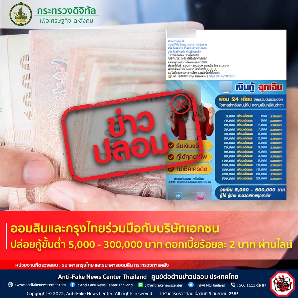 ข่าวปลอม!ออมสินและกรุงไทยร่วมมือกับบริษัทเอกชน ปล่อยกู้ขั้นต่ำ 5,000 – 300,000 บาท ดอกเบี้ยร้อยละ 2 บาท ผ่านไลน์