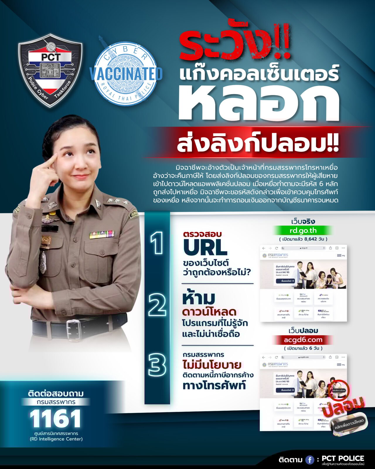 3.การติดต่อจากเจ้าหน้าที่ของรัฐทุกครั้ง ควรตรวจสอบจากเบอร์กลางของหน่วยงานนั้นๆ และกรณีเจ้าหน้าที่สรรพากรไม่มีนโยบายขอคืนภาษีผ่านการดำเนินการทางโทรศัพท์ จะดำเนินการจ่ายคืนเป็นเช็คธนาคารกรุงไทย จำกัด เท่านั้นโดยเว็บไซต์จริงของกรมสรรพากรคือ https://www.rd.go.th