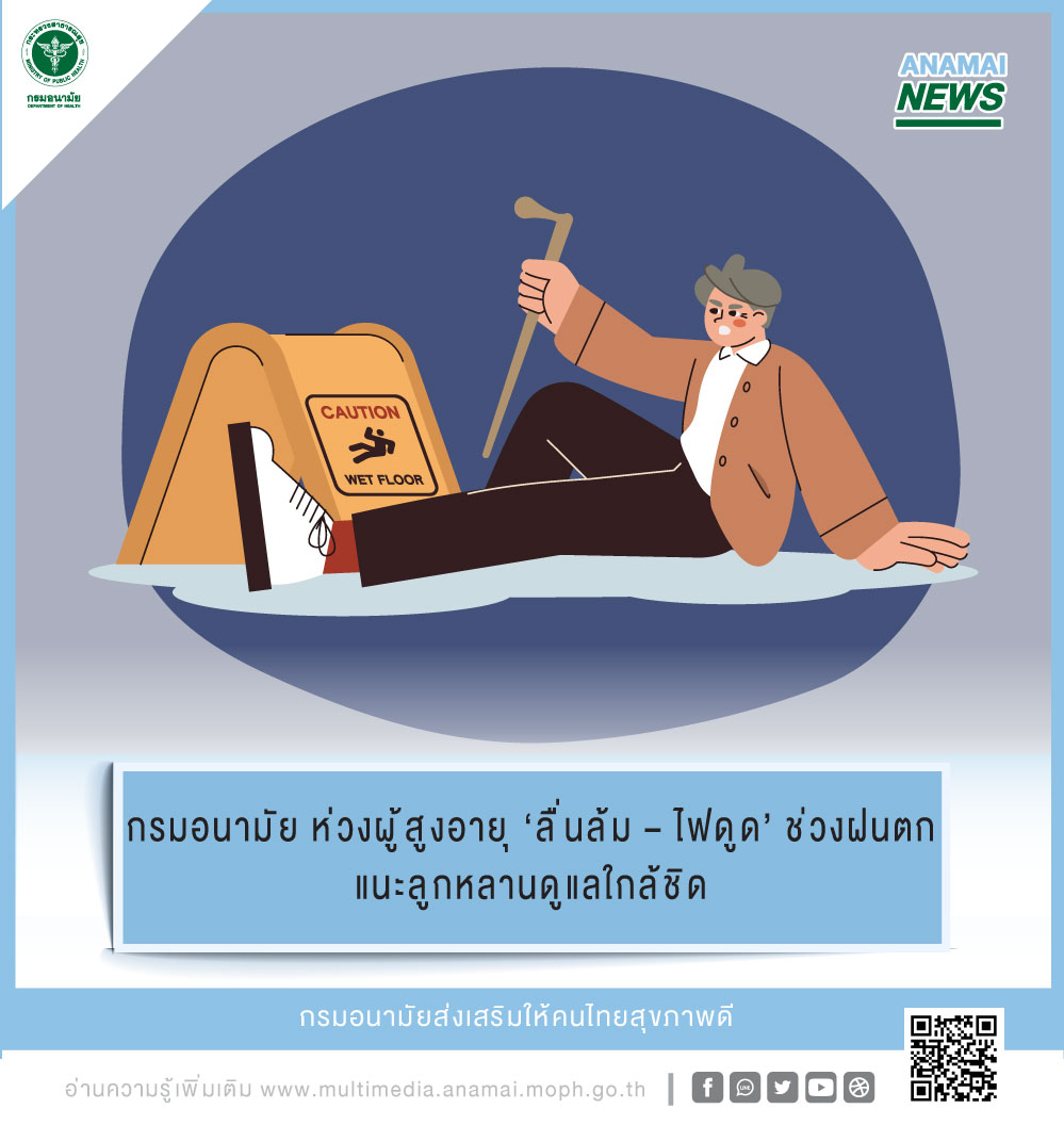 กรมอนามัย กระทรวงสาธารณสุข ห่วงผู้สูงอายุ “ลื่นล้ม – ไฟดูด” ในช่วงฝนตกหนัก และในพื้นที่ น้ำท่วมขัง แนะลูกหลานดูแลใกล้ชิดเมื่ออยู่นอกบ้านและในบ้าน