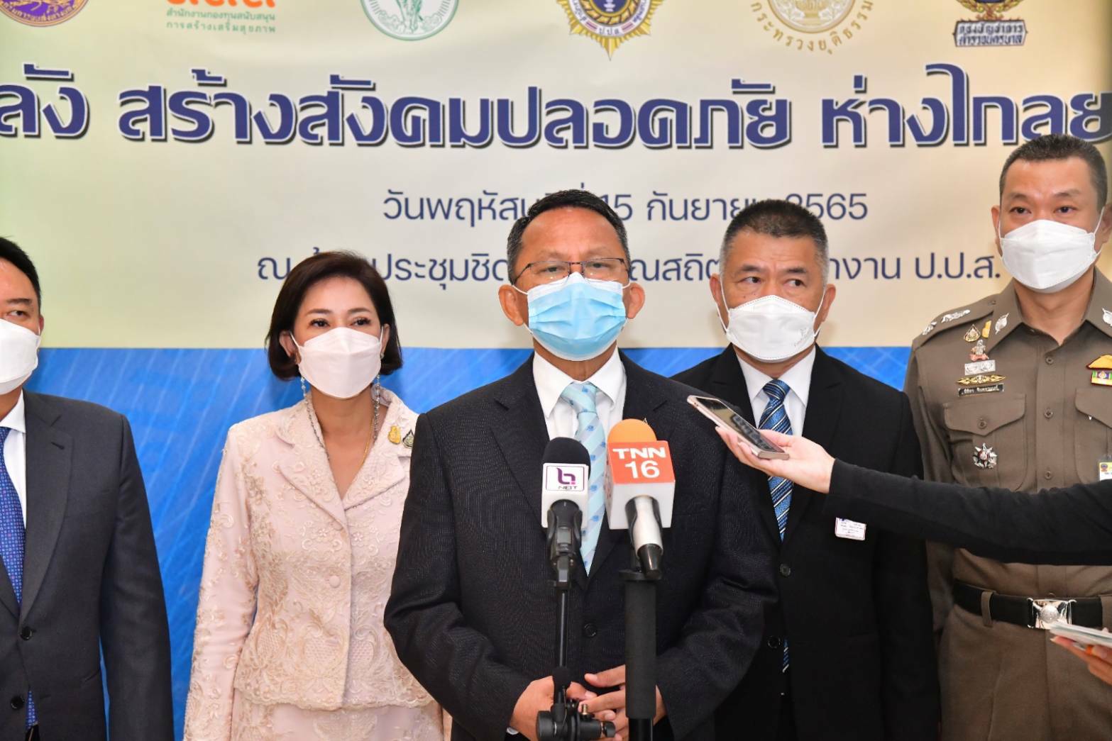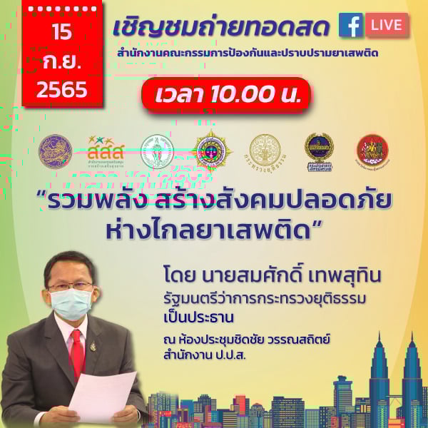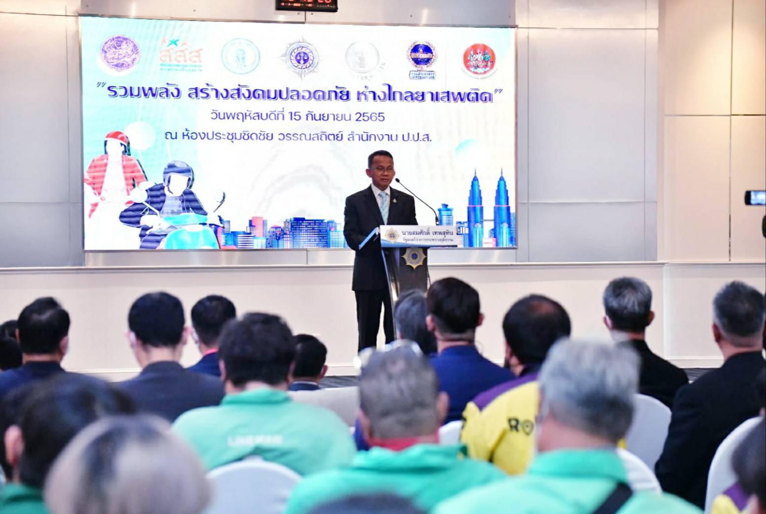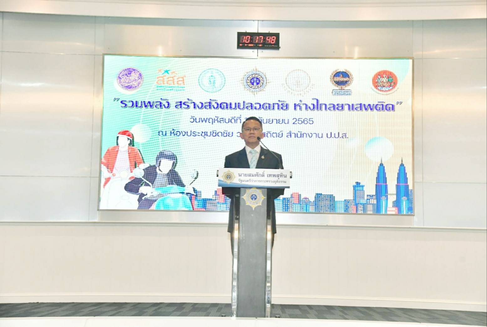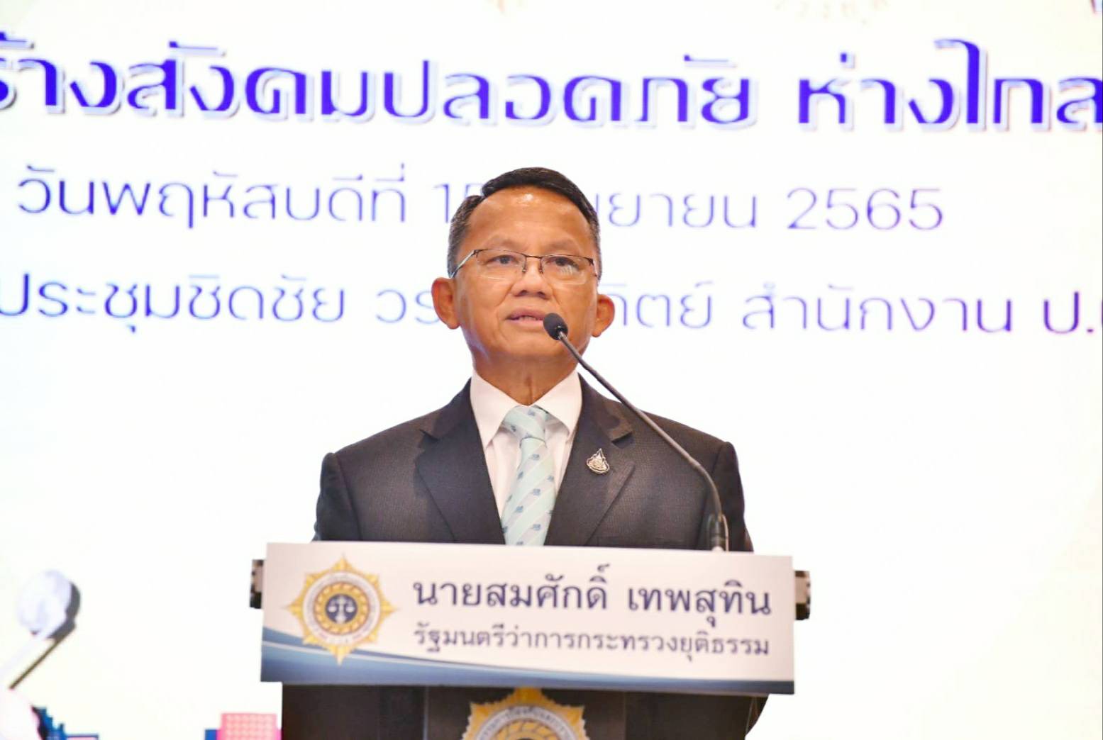 วันที่ 15 กันยายน 2565 เมื่อเวลา 10.00 น. นายสมศักดิ์ เทพสุทิน รัฐมนตรีว่าการกระทรวงยุติธรรม เป็นประธานเปิดงาน “รวมพลัง สร้างสังคมปลอดภัย ห่างไกลยาเสพติด” เพื่อรณรงค์สร้างการรับรู้และสร้างภูมิคุ้มกันยาเสพติดในกลุ่มแรงงานนอกระบบ โดยมี นางสาวณัฐธ์ภัสส์ ยงใจยุทธ ผู้ช่วยรัฐมนตรีประจำกระทรวงยุติธรรม นายวิชัย ไชยมงคล เลขาธิการ ป.ป.ส. ผู้บริหารกระทรวง กองบัญชาการตำรวจนครบาล กรมสวัสดิการและคุ้มครองแรงงาน กรมการขนส่งทางบก ผู้บริหารจากบริษัทเดลิเวอร์รี่ 7 แห่ง เช่น ไลน์แมน แกร็ป ฟู้ดแพนด้า โรบินฮู้ด แอร์เอเชีย ซุปเปอร์แอพ ช้อปปี้ ลาล่ามูฟ สมาคมผู้ขับขี่รถจักรยานยนต์รับจ้าง และเครือข่ายภาคประชาชนกองทุนแม่ของแผ่นดิน กว่า 100 คน เข้าร่วมงาน