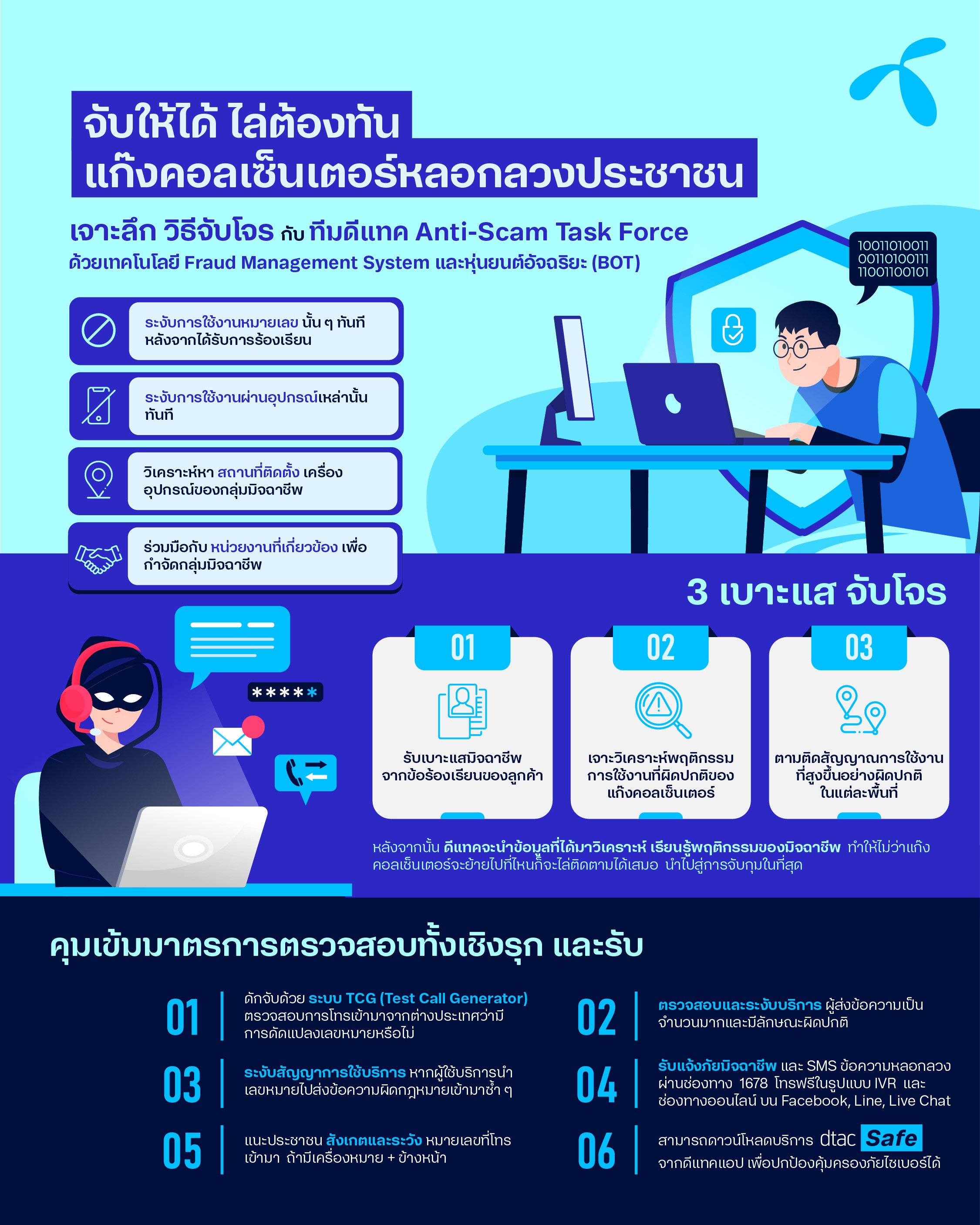 ทีมงาน Anti-Scam Task Force ที่ดีแทค มีวิธีจัดการแก๊งคอลเซ็นเตอร์ และ SMS หลอกลวง ให้ทันเกมมิจฉาชีพ โดยการรวบรวมข้อร้องเรียนจากลูกค้า มาประมวลผลร่วมกับระบบตรวจับพฤติกรรมการใช้งาน และระบบตรวจจับสัญญาณการใช้งานในพื้นที่ ที่ผิดปกติมาวิเคราะห์ เพื่อจัดสร้างเป็นโปรไฟล์สำหรับใช้ในการตรวจจับกลุ่มมิจฉาชีพ โดยระบบ จะมีการเรียนรู้ลักษณะของมิจฉาชีพอย่างสม่ำเสมอเพื่อให้สามารถไล่ตามพฤติกรรมที่เปลี่ยนไปของกลุ่มมิจฉาชีพ