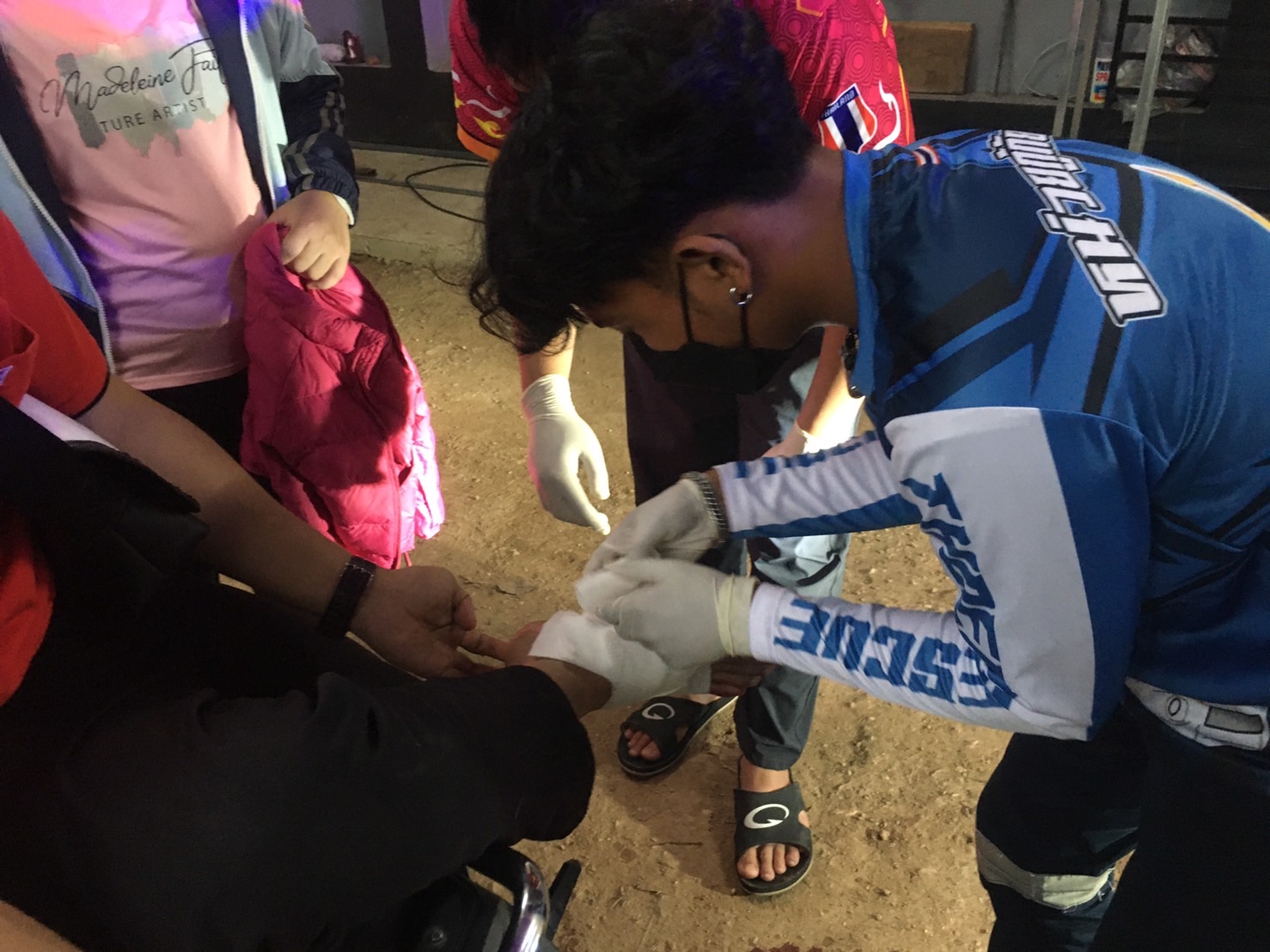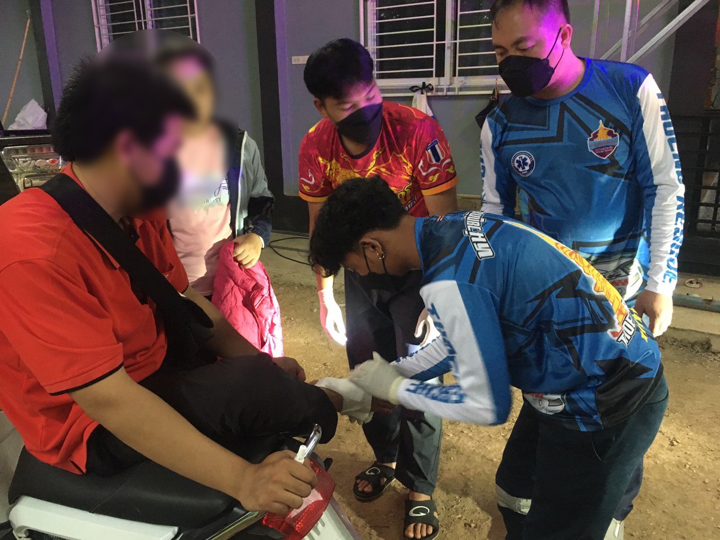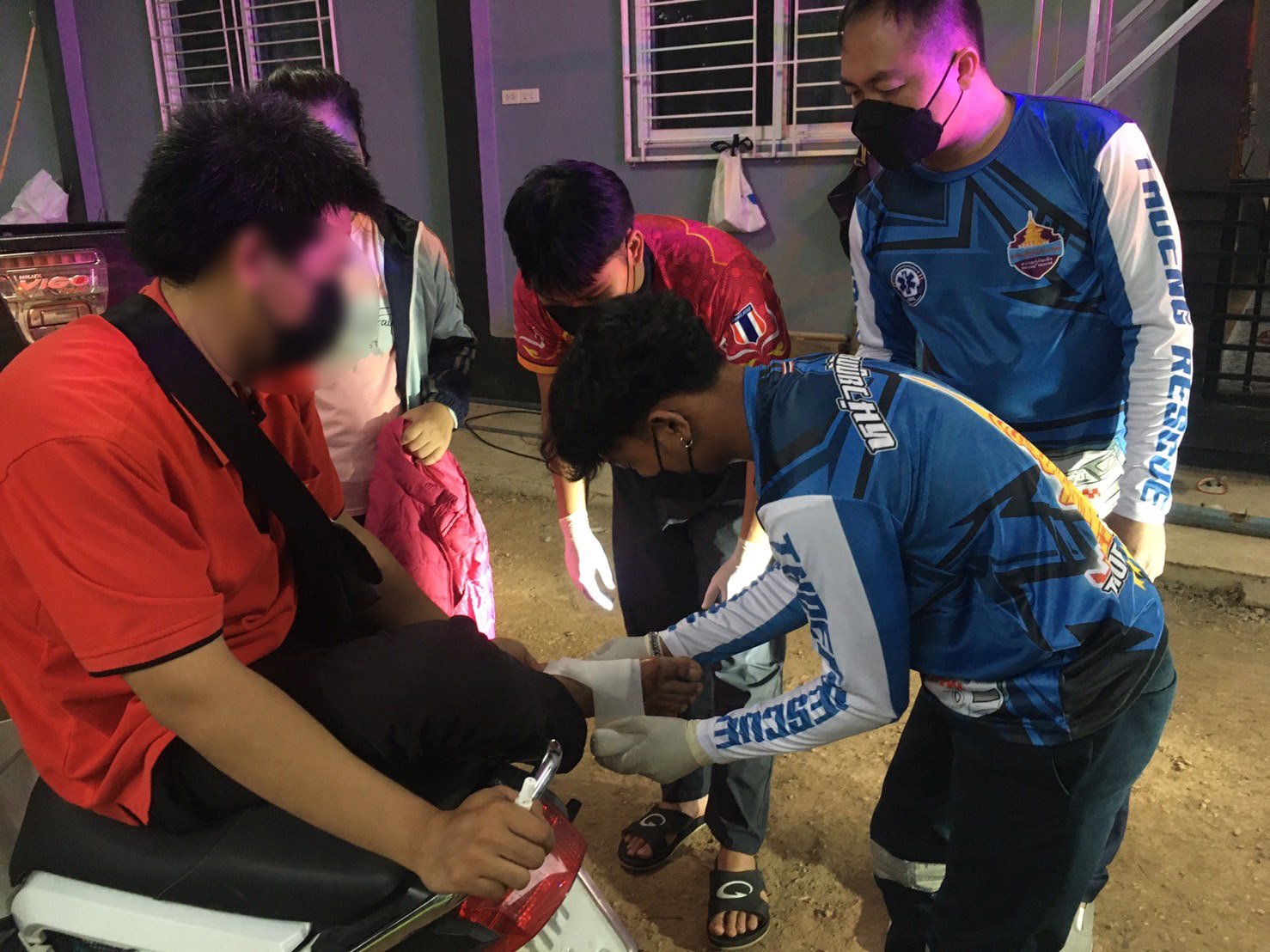 ที่เกิดเหตุ เป็นบ้านที่กำลังอยู่ระหว่างการก่อสร้าง พบผู้บาดเจ็บเป็นชาย ทราบชื่อในภายหลังคือนายณัฐพงษ์ (สงวนนามสกุล) อายุ 34 ปี ชาวบ้าน ม.10 ต.เวียง อ.เทิง จ.เชียงราย มีบาดแผลฉีดขาดเป็นแนวยาวประมาณ 10 ซม. ที่บริเวณเท้าขวาด้านใน จากการตรวจแผลเบื้องต้นพบมีเศษใบเจียรหักคาบาดแผลอยู่ด้วย ผู้บาดเจ็พบรู้สึกตัวดี อาสากู้ภัยจึงปฐมพยาบาลเบื้องต้น ก่อนนำส่งไปรักษาที่ รพ.เทิง