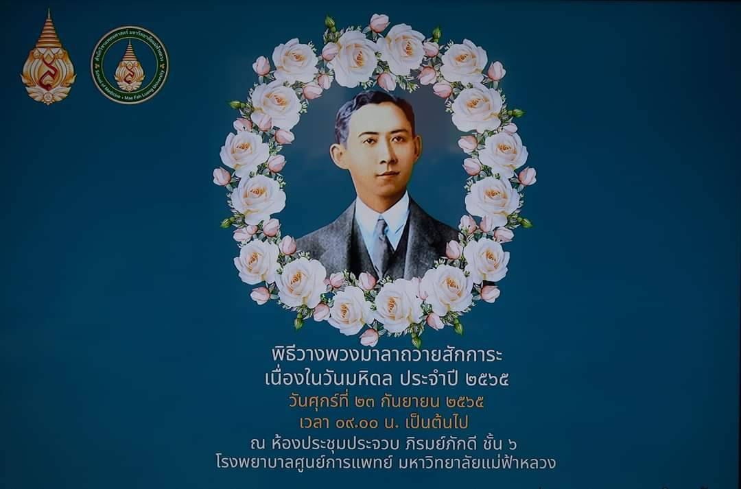 วันที่ 23 กันยายน 2565 ณ ห้องประชุม ชั้น 6 โรงพยาบาลศูนย์การแพทย์มหาวิทยาลัยแม่ฟ้าหลวง ต.นางแล อ.เมืองเชียงราย จ.เชียงราย รศ. ดร.ชยาพร วัฒนศิริ อธิการบดีมหาวิทยาลัยแม่ฟ้าหลวง พร้อมด้วยนายคณิต คงช่วย หัวหน้าสำนักงานจังหวัดเชียงราย หัวหน้าส่วนราชการ องค์กรเอกชน และประชาชน นำพวงมาลาถวายสักการะ เพื่อน้อมลำลึกในพระมหากรุณาธิคุณ สมเด็จพระมหิตลาธิเบศร อดุลยเดชวิกรม พระบรมราชชนก
