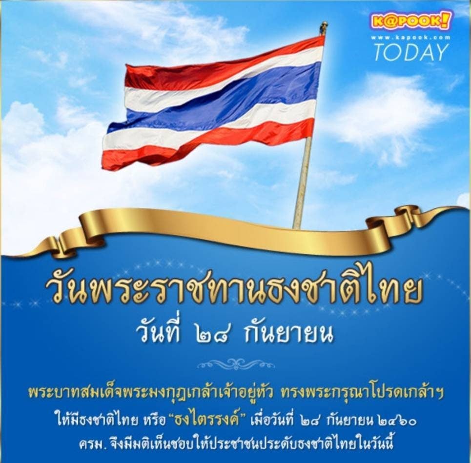 ทั้งนี้ รัฐมนตรีได้มีมติเห็นชอบให้ วันที่ 28 กันยายน ของทุกปีเป็น วันพระราชทานธงชาติไทย โดยให้เริ่มในวันที่ 28 กันยายน พ.ศ. 2560 เป็นปีแรก เนื่องในโอกาสครบรอบ 100 ปี ธงชาติไทย แต่ไม่ถือเป็นวันหยุดราชการ รวมทั้งกำหนดให้มีการชักธงและประดับธงชาติไทยในวันดังกล่าวด้วย เพื่อเป็นการสร้างความภาคภูมิใจของคนในชาติ และน้อมรำลึกถึงพระมหากรุณาธิคุณในพระบาทสมเด็จพระมงกุฎเกล้าเจ้าอยู่หัว และถือเป็นประเทศที่ 54 ของโลกที่มีวันธงชาติ โดยการกำหนดวันธงชาติของประเทศ กำหนดให้ใช้ธงไตรรงค์เป็นธงชาติ และใช้มาจนถึงทุกวันนี้ รวมเวลา 105 ปี ซึ่งการพระราชทานธงชาติไทย สะท้อนถึงความเป็นศูนย์รวมจิตใจของคนไทย ทั้งสถาบันชาติ ศาสนา และพระมหากษัตริย์