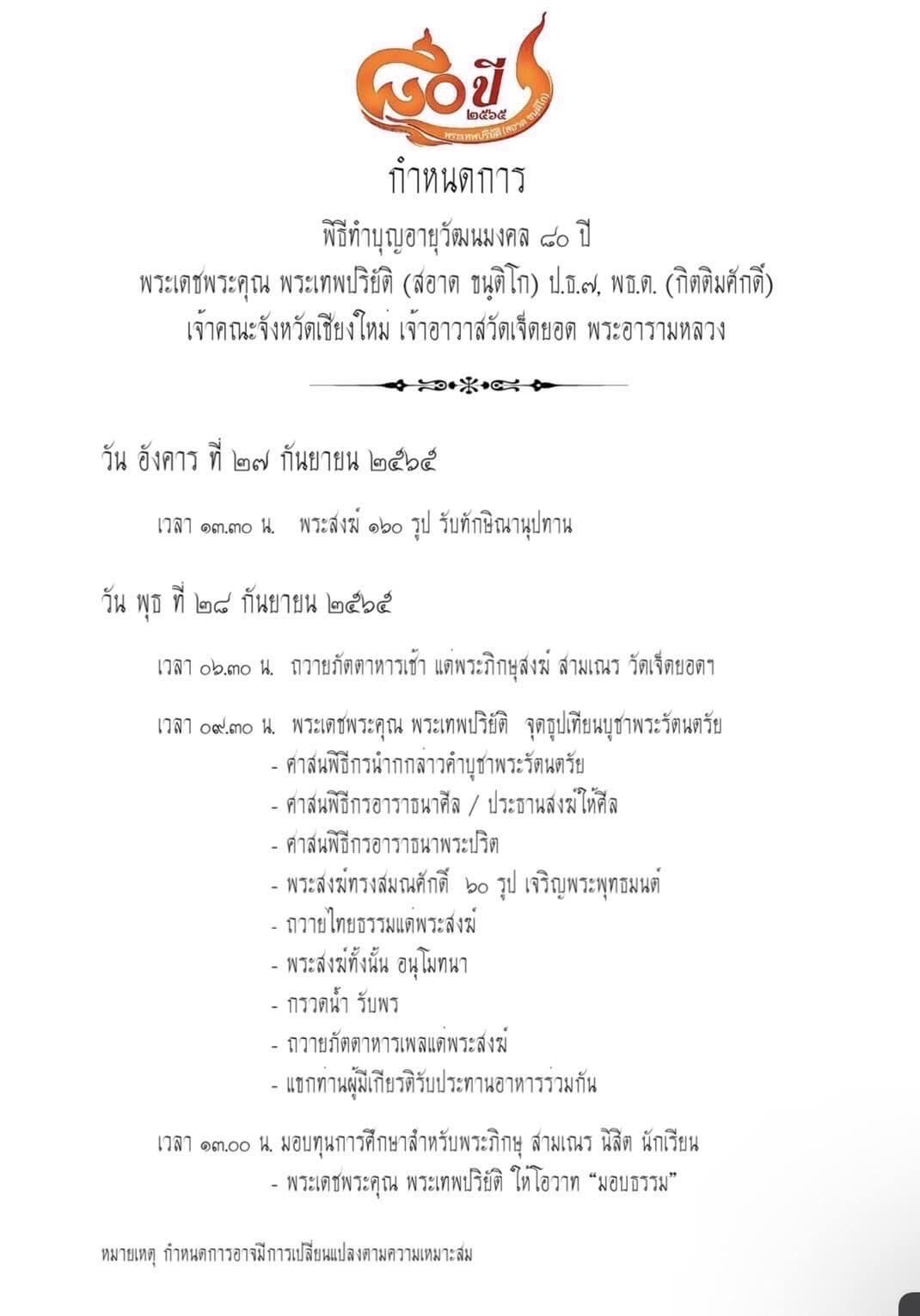 เมื่อวันที่ 27 กันยายน 2565 ผู้บริหาร คณาจารย์ เจ้าหน้าที่ นิสิต มหาวิทยาลัยมหาจุฬาลงกรณราชวิทยาลัย วิทยาเขตเชียงใหม่ นำโดย พระครูสิริบรมธาตุพิทักษ์ ,ผศ.ดร.รองอธิการบดี พระครูพิสุทธิ์ชยานุศาสก์ ผู้อำนวยการสำนักงานวิทยาเขต เข้ามุทิตาจิตพระเดชพระคุณ “พระเทพปริยัติ” (สะอาด ขนฺติโก ) ป.ธ.7,พธ.ต.(กิตติมศักดิ์) เจ้าคณะจังหวัดเชียงใหม่ เจ้าอาวาสวัดเจ็ดยอด พระอารามหลวง เนื่องในพิธีทำบุญเจริญอายุวัฒนมงคล 80 ปี 60 พรรษา ณ ศาลา ดร.อุดรพันธ์ จันทรวิโรจน์ วัดเจ็ดยอด พระอารามหลวง อำเภอเมืองเชียงใหม่ จังหวัดเชียงใหม่.
