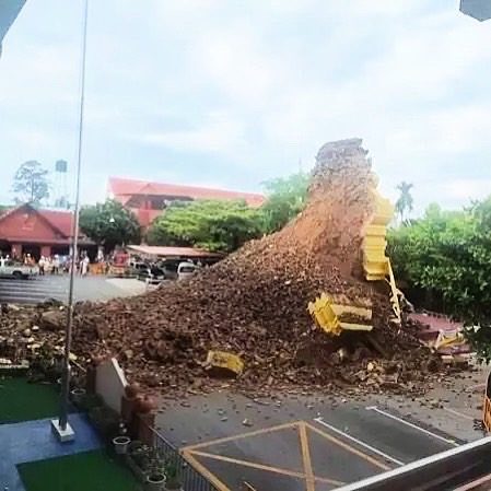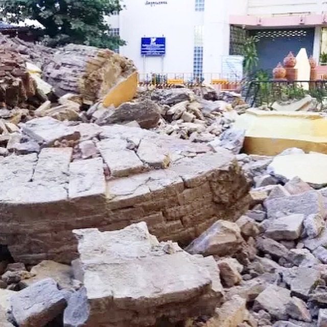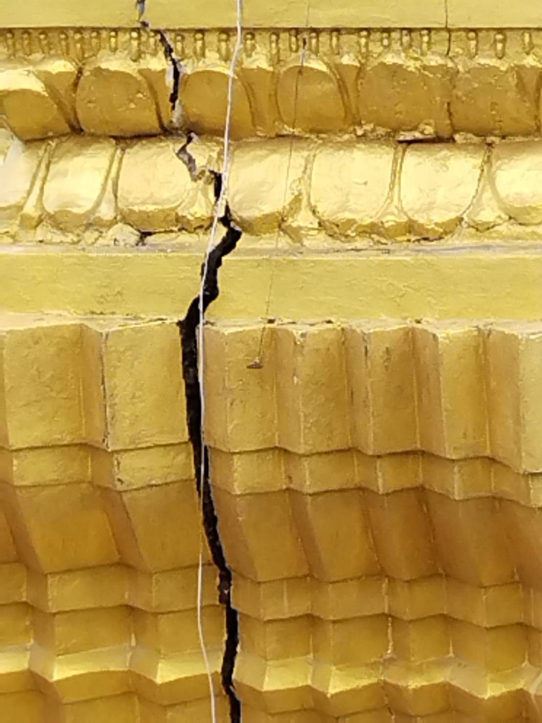 ก่อนเจ้าหน้าที่จะกลับ พระธาตุเจดีย์ก็พังลงมาทั้งองค์ต่อหน้าทันที ซึ่งเจดีย์ตั้งอยู่ภายในวัด สูงประมาณตึก 3 ชั้น ก่อนหน้านี้มีรอยแตกร้าวเป็นทางยาว แต่ก็ยังไม่ได้รับการบูรณะ จนกระทั่งเมื่อช่วงเช้าที่ผ่านมาได้เกิดฝนตกอย่างต่อเนื่องมาอีก จึงทำให้ดินภายในชุ่มน้ำและเกิดน้ำหนัก จนโครงสร้างพระเจดีย์ธาตุรับน้ำหนักไม่ไหวและได้พังถล่มลงมาดังกล่าว