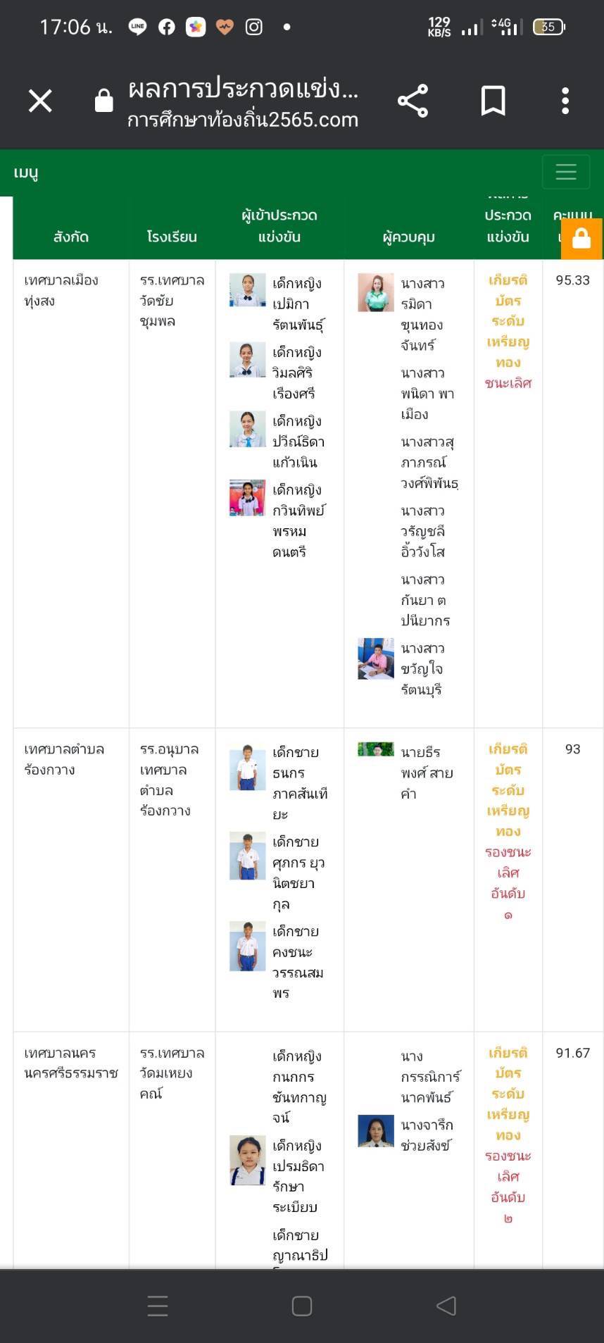 ทำนองสรภัญญะ ประเภททีม 5 คน (เพชรสรภัญญะ) และรับรางวัลเมื่อวันที่ 2 ต.ค.65 ตรงกับการแข่งขันทักษะวิชาการระดับประเทศ ณ ทม.ทุ่งสง จ.นครศรีธรรมราช พอดีทาง ทต.ร้องกวาง ได้มอบหมายให้ รุ่งอรุณ วันจา ผู้อำนวยการกองการศึกษา ทต.ร้องกวาง มาเป็นตัวแทนในนามของโรงเรียนในการรับรางวัลครั้งนี้ ขอขอบคุณ คุณครู ผู้ปกครองนักเรียน และนักเรียนทุกคนที่สามารถฝ่าฝัน และมุ่งมั่นตั้งใจนำเอารางวัลมายัง อ.ท.ร.สร้างชื่อเสียงให้กับโรงเรียนและวงศ์ตระกูล