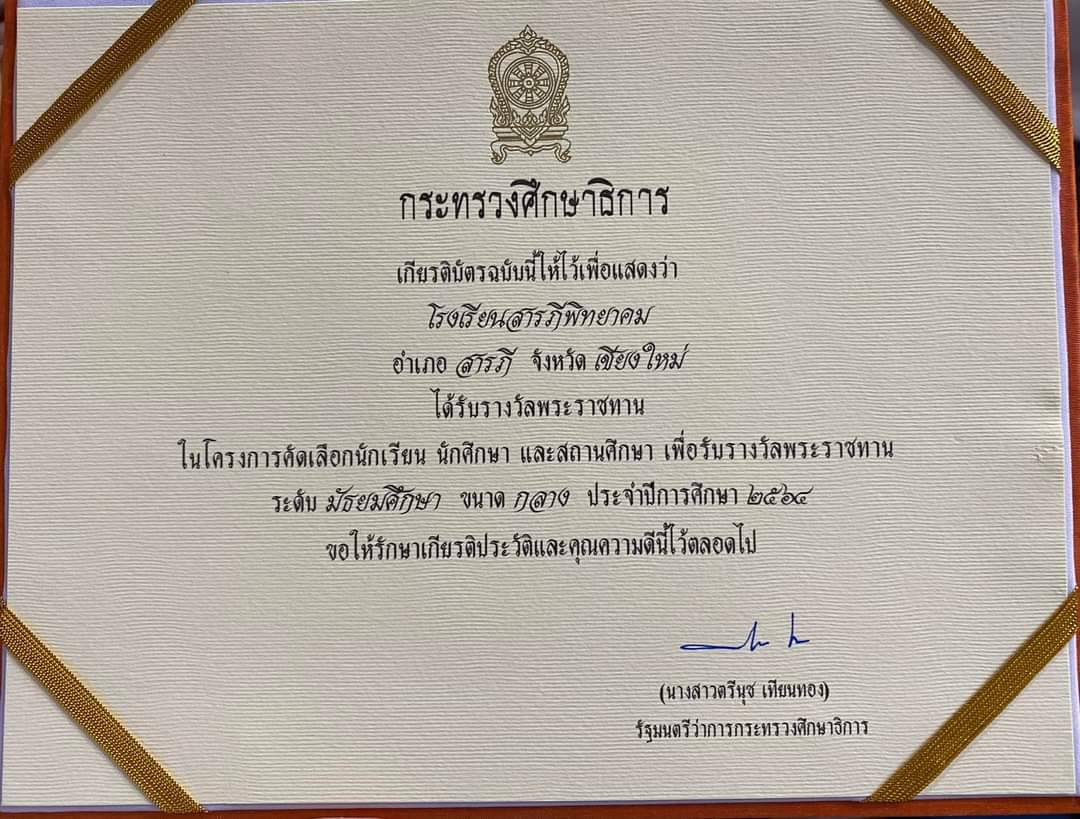 โรงเรียนสารภีพิทยาคม รับรางวัลพระราชทาน ระดับมัธยมศึกษา ขนาดกลาง ประจำปีการศึกษา 2564
