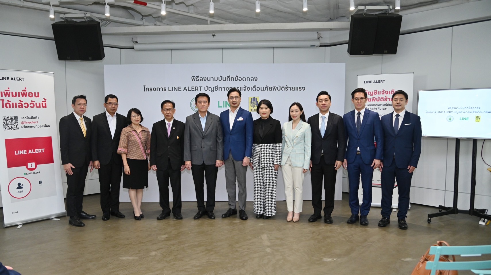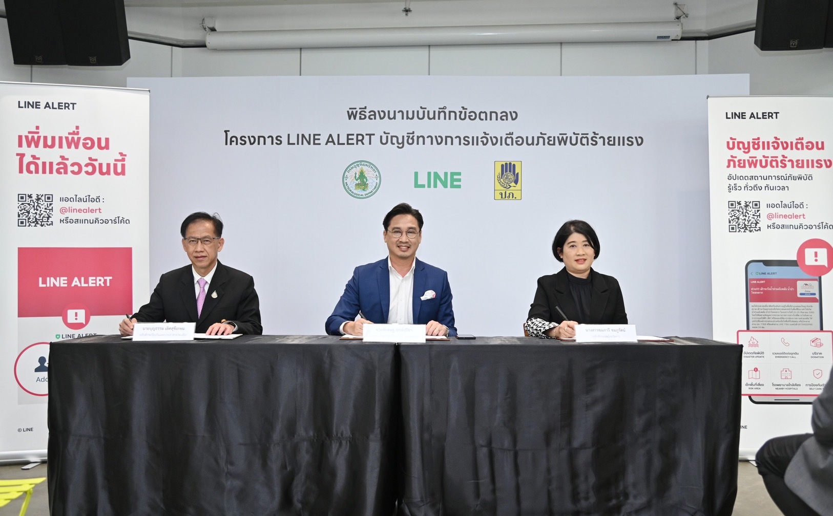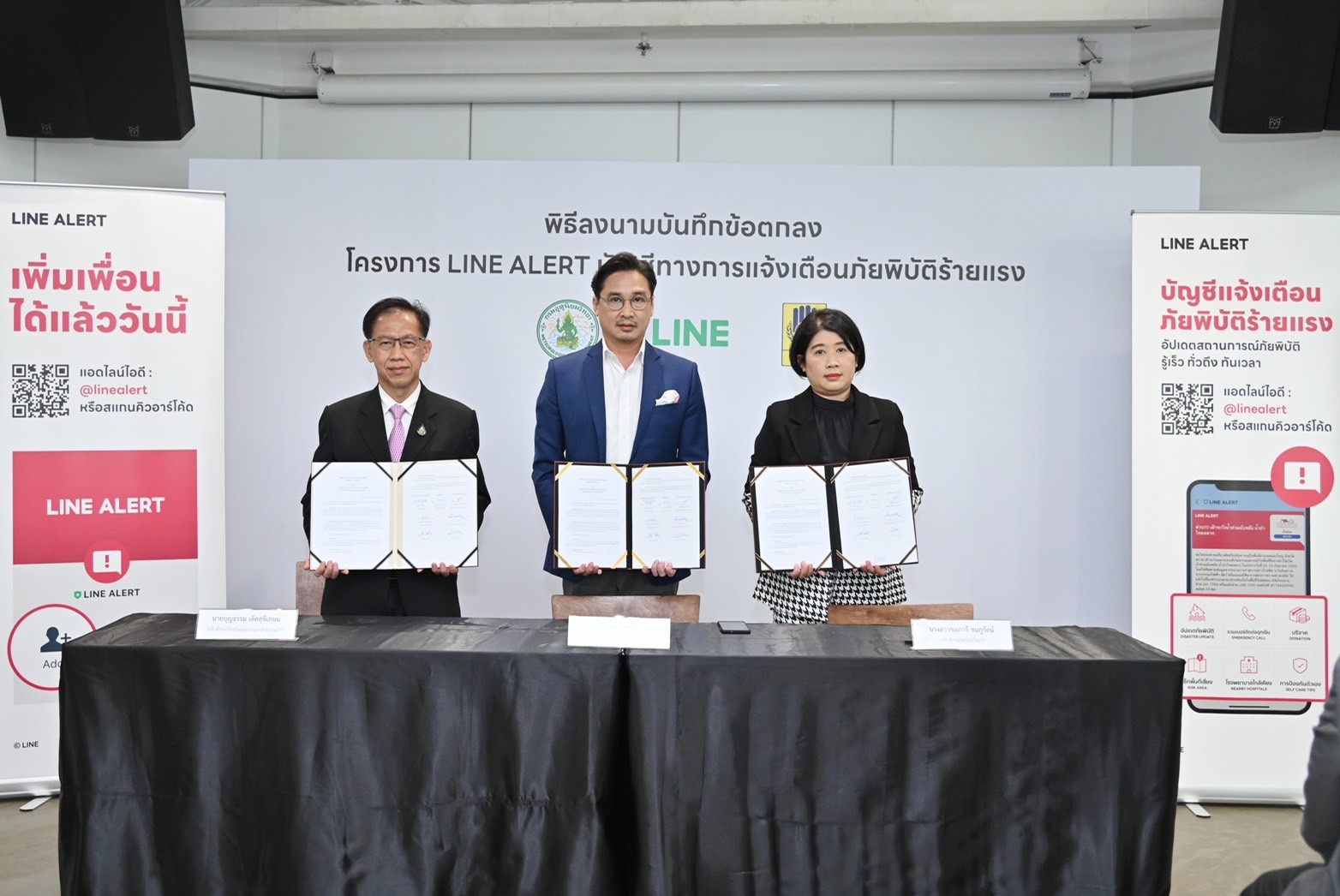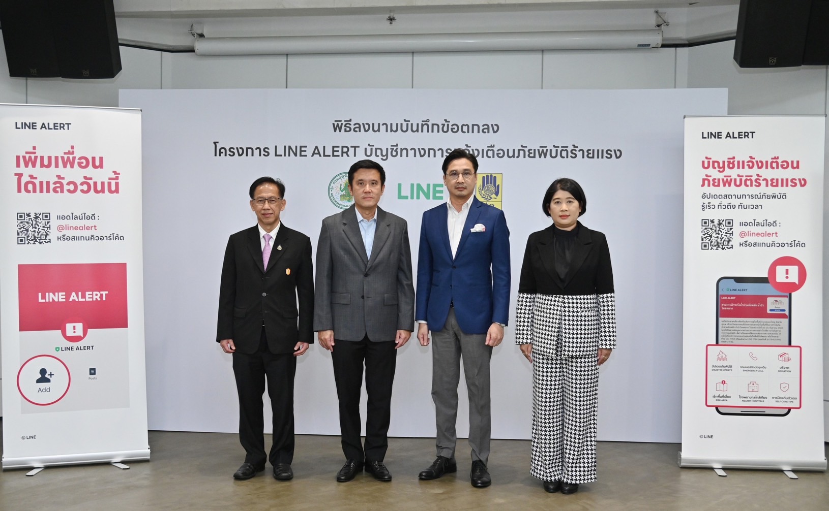 เมื่อเร็วๆ นี้ ดร. ชมภารี ชมภูรัตน์ อธิบดีกรมอุตุนิยมวิทยา นายบุญธรรม เลิศสุขีเกษม อธิบดีกรมป้องกันและบรรเทาสาธารณภัย และ ดร. พิเชษฐ ฤกษ์ปรีชา ประธานเจ้าหน้าที่บริหาร LINE (ประเทศไทย) ร่วมลงนามบันทึกความเข้าใจว่าด้วยความร่วมมือในการสร้างสรรค์และให้บริการ LINE ALERT โดยมี นายชัยวุฒิ ธนาคมานุสรณ์ รัฐมนตรีว่าการกระทรวงดิจิทัลเพื่อเศรษฐกิจและสังคม ว่าที่ร้อยตรี ธนะสิทธิ์ เอี่ยมอนันชัย รองอธิบดีกรมอุตุนิยมวิทยา ฝ่ายวิชาการ และนายรัฐพล นราดิศร รองอธิบดีกรมป้องกันและบรรเทาสาธารณภัย เป็นสักขีพยาน ณ ไลน์ พาร์ค ออฟฟิส LINE ประเทศไทย ชั้น 18 อาคารเกสร ทาวเวอร์ ราชประสงค์