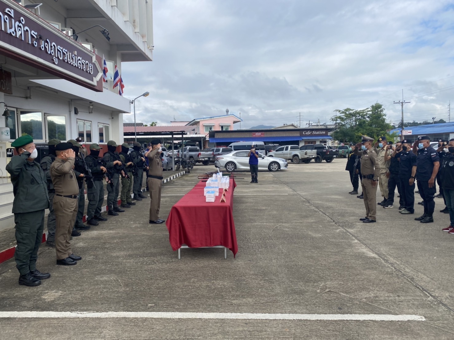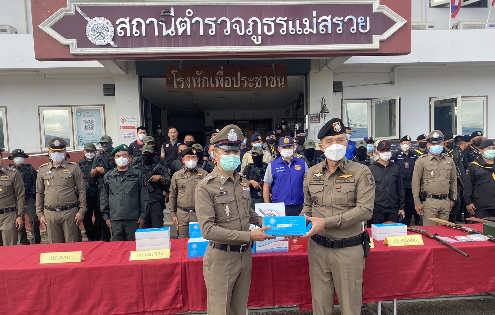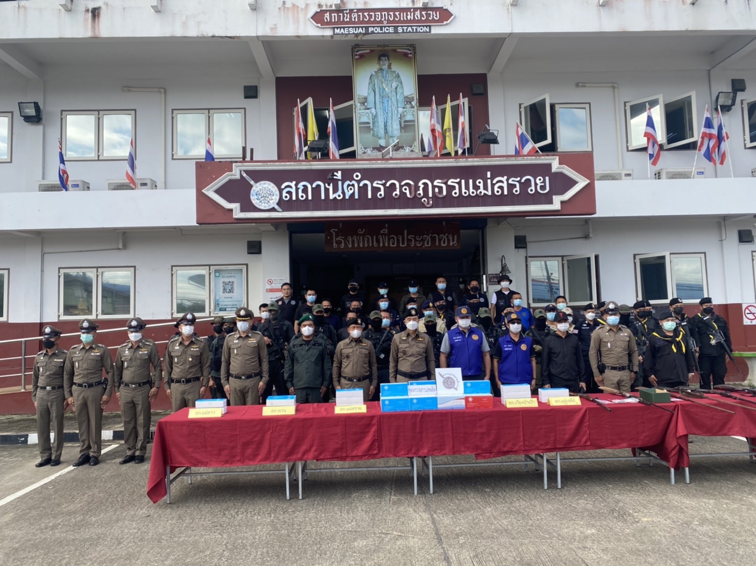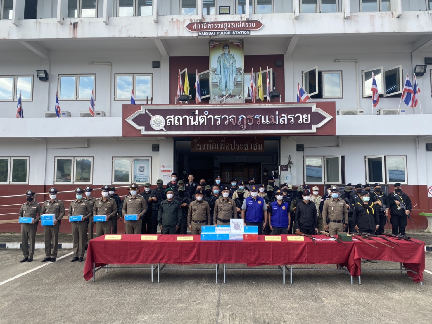 เวลา 09.00 น. วันที่ 12 ต.ค.65 ที่ สภ.แม่สรวย อ.แม่สรวย จ.เชียงราย พล.ต.ต.ดุลเดชา อาชวะสมิตระกูล ผบก.ภ.จ.เชียงราย พ.ต.อ.พงษ์สวัสดิ์ ไชยบาล รอง ผบก. พ.ต.อ.รัฐพล น้อยช่างคิด ผกก.กก.สส.พร้อมเจ้าหน้าที่ตำรวจ และฝ่ายปกครอง ร่วมแถลงผลการระดมปิดล้อมตรวจค้น เป้าหมายยาเสพติดในพื้นที่ จ.เชียงราย โดยผลการตรวจค้น ยึดอาวุธปืน จำนวน 6 กระบอก ยาบ้า จำนวน 1,846 เม็ด เฮโรอีน 22.78 กรัม รถจักรยานยนต์ 1 คัน พร้อมกับได้มอบชุดตรวจสารเสพติดในปัสสาวะ ให้แก่ สภ.ในสังกัด จำนวน 1,500 ชุด