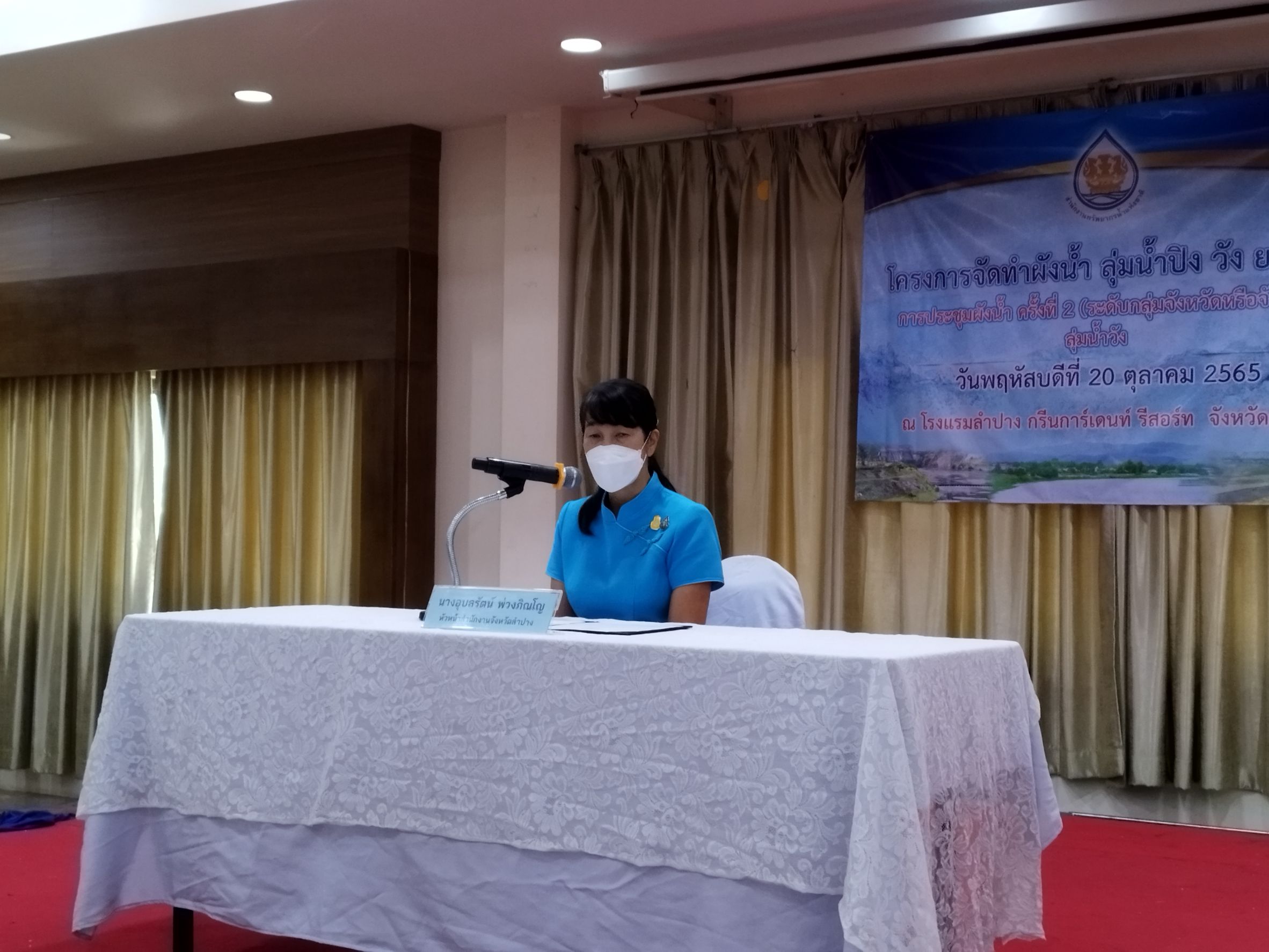 วันที่ 20 ตุลาคม 2565 สทนช. ร่วมกับกลุ่มบริษัทที่ปรึกษา จัดการประชุมผังน้ำ ครั้งที่ 2 พื้นที่ลุ่มน้ำวัง โครงการจัดทำผังน้ำ ลุ่มน้ำปิง วัง ยม น่าน ณ โรงแรมลำปางกรีนการ์เดนท์ อ.เมือง จ.ลำปาง เพื่อนำเสนอร่างผังน้ำ ฉบับที่ 1 ให้ทุกภาคส่วนได้รับทราบ พร้อมรับฟังความคิดเห็นและข้อเสนอแนะ เพื่อนำไปประกอบการพิจารณาปรับปรุงจัดทำร่างผังน้ำ และนำมารับฟังความคิดเห็นในการประชุมครั้งถัดไป โดยมี นางอุบลรัตน์ พ่วงภิญโญ หัวหน้าสำนักงานจังหวัดลำปางเป็นประธาน พร้อมด้วยคณะกรรมการลุ่มน้ำ ผู้แทนหน่วยงานของรัฐ องค์กรปกครองส่วนท้องถิ่น และประชาชนที่เกี่ยวข้อง เข้าร่วมประชุม