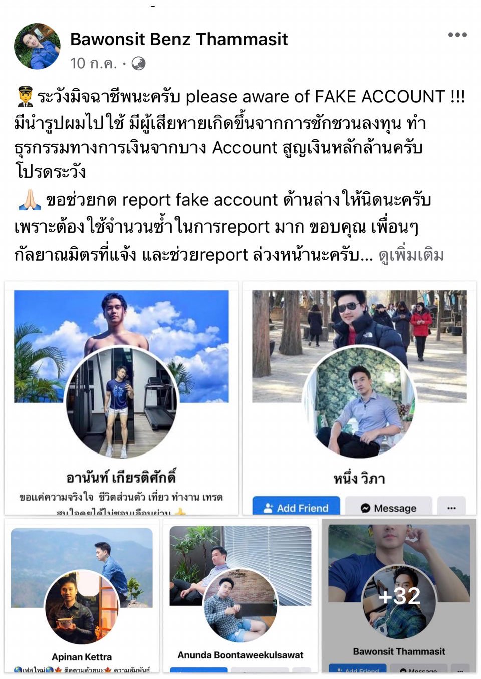 จึงขอเตือนภัย ผู้เสียหายหรือเคยถูกใช้รูปดังกล่าวในเฟซบุ๊ก และ IG และฝากเตือนไม่ควรไว้ใจใคร หากไม่เจอตัวจริง ในแง่ของการลงทุนมีความเสี่ยงอยู่มาก รวมถึงการยืมเงิน ไม่ควรไว้ใจใคร ซึ่งตนใช้เพียง accout เดียว คือ Bawonsit Benz Thammasit และ IG ชื่อ Benz_Bawonsit เท่านั้น