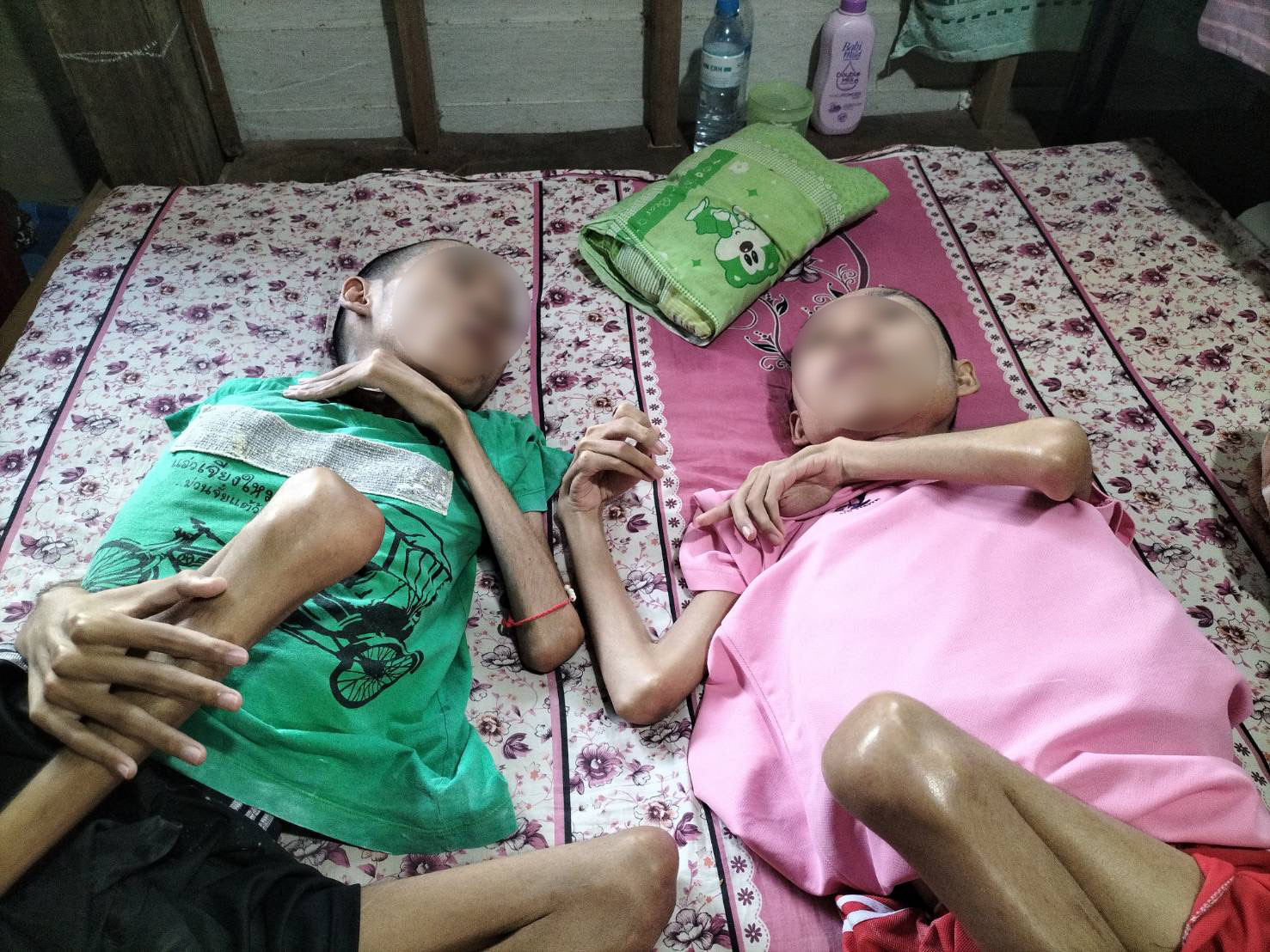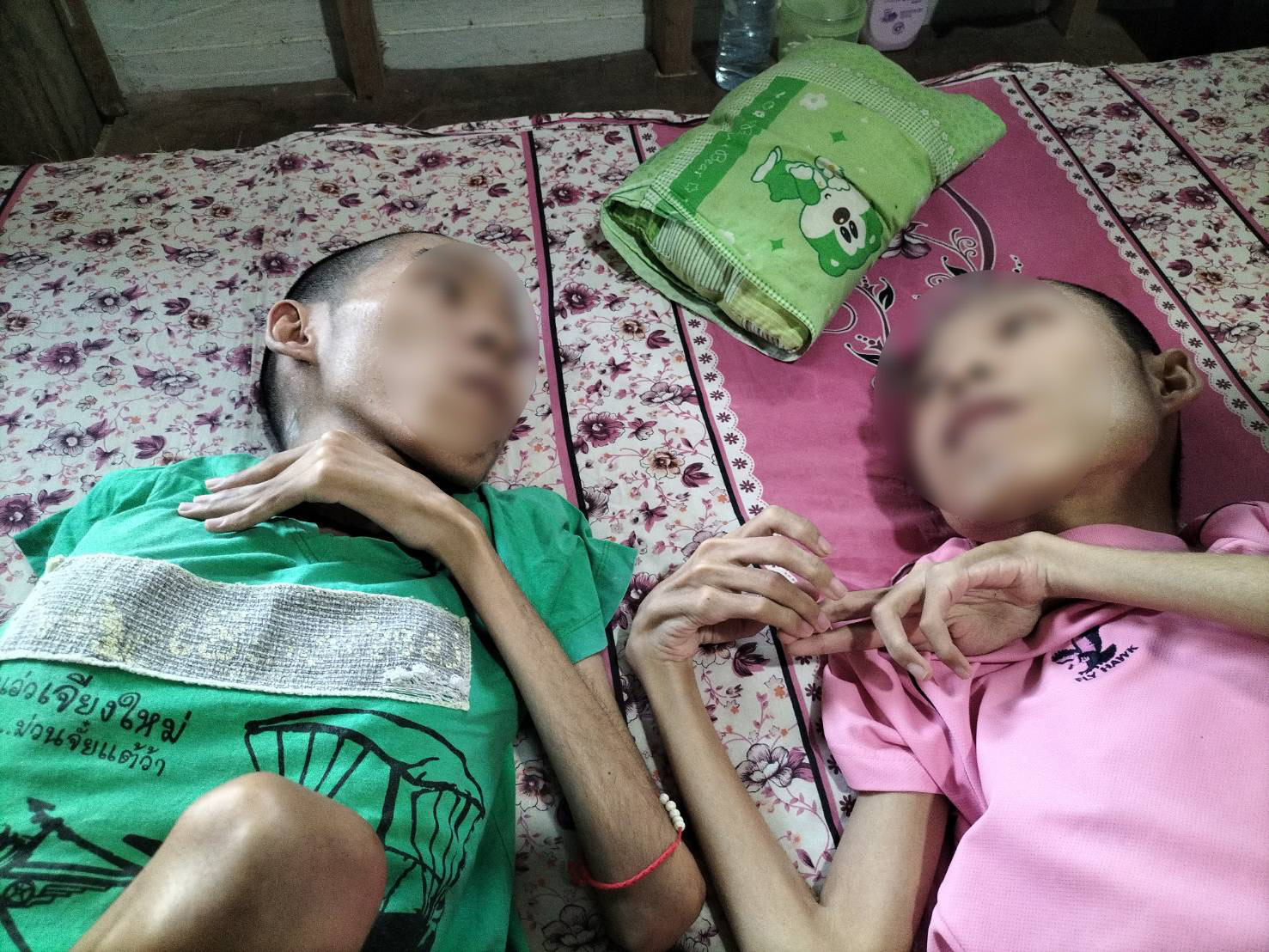 น.ส.ชุติมณฑน์ ใจแก้ว อายุ 46 ปี อสม. และผู้บริบาลดูแลผู้ป่วยติดเตียง อบต.แม่ลอย เผยว่า ตอนนี้คนที่อาการหนักก็คือน้องแมน เพราะคอติด คอล็อค หมุนคอไม่ได้เลย นอนท่าไหนท่านั้น ถ้าจะกินข้าวก็ต้องเอาหมอน ตอนนี้มีแผลกดทับที่ศรีษะด้วย และอีกปัญหาคือบริเวณข้อต่อของทั้งคู่จะพับล็อค ยืดไม่ได้ ยิ่งช่วงนี้อากาศเริ่มหนาวเย็นก็จะส่งผลให้เจ็บปวดบริเวณข้อต่อเพิ่มมากขึ้น